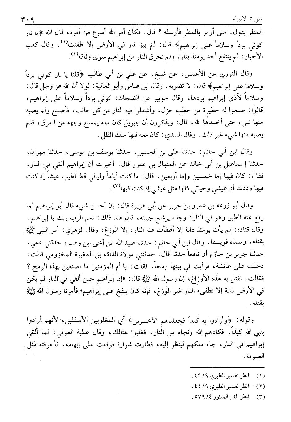 الْمَطَرِ يَقُولُ: مَتَى أُومَرُ بِالْمَطَرِ فَأَرْسِلُهُ؟ قَالَ: فَكَانَ أَمْرُ اللَّهِ أَسْرَعَ مِنْ أَمْرِهِ، قَالَ الله يَا نارُ كُونِي بَرْداً وَسَلاماً عَلى إِبْراهِيمَ قَالَ: لَمْ يَبْقَ نَارٌ فِي الْأَرْضِ إِلَّا طُفِئَتْ «1» . وَقَالَ كَعْبُ الْأَحْبَارِ: لَمْ يَنْتَفِعْ أَحَدٌ يَوْمَئِذٍ بِنَارٍ، وَلَمْ تُحْرِقِ النَّارُ مِنْ إِبْرَاهِيمَ سِوَى وِثَاقِهِ «2» .