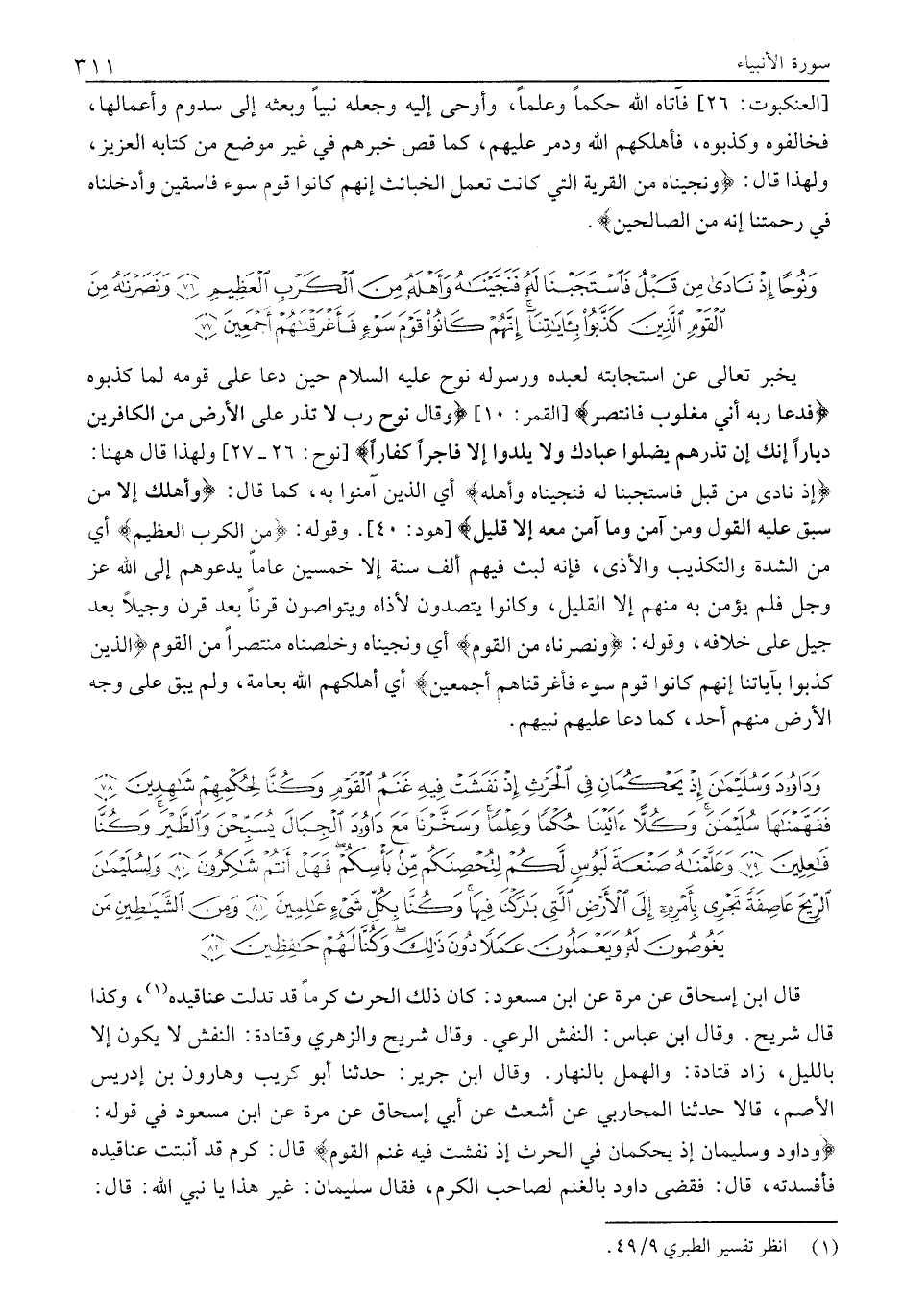 إِذْ نَادَى مِنْ قَبْلُ فَاسْتَجَبْنا لَهُ فَنَجَّيْناهُ وَأَهْلَهُ أَيِ الَّذِينَ آمَنُوا بِهِ، كَمَا قَالَ: وَأَهْلَكَ إِلَّا مَنْ سَبَقَ عَلَيْهِ الْقَوْلُ وَمَنْ آمَنَ وَما آمَنَ مَعَهُ إِلَّا قَلِيلٌ [هُودٍ: 40] . وَقَوْلُهُ: مِنَ الْكَرْبِ الْعَظِيمِ أَيْ مِنَ الشِّدَّةِ وَالتَّكْذِيبِ وَالْأَذَى، فَإِنَّهُ لَبِثَ فِيهِمْ أَلْفَ سَنَةٍ إِلَّا خَمْسِينَ عَامًا يَدْعُوهُمْ إِلَى اللَّهِ عَزَّ وَجَلَّ فَلَمْ يُؤْمِنْ بِهِ مِنْهُمْ إِلَّا الْقَلِيلُ، وَكَانُوا يتصدون لِأَذَاهُ وَيَتَوَاصَوْنَ قَرْنًا بَعْدَ قَرْنٍ وَجِيلًا بَعْدَ جِيلٍ عَلَى خِلَافِهِ، وَقَوْلُهُ: وَنَصَرْناهُ مِنَ الْقَوْمِ أَيْ وَنَجَّيْنَاهُ وَخَلَّصْنَاهُ مُنْتَصِرًا مِنَ الْقَوْمِ الَّذِينَ كَذَّبُوا بِآياتِنا إِنَّهُمْ كانُوا قَوْمَ سَوْءٍ فَأَغْرَقْناهُمْ أَجْمَعِينَ أَيْ أَهْلَكَهُمُ اللَّهُ بِعَامَّةٍ، وَلَمْ يُبْقِ على وجه الأرض منهم أحد، كما دعا عليهم نبيهم.
