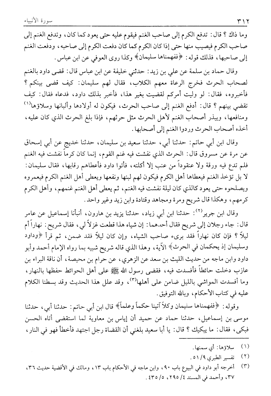 وَقَالَ ابْنُ جَرِيرٍ «2» : حَدَّثَنَا ابْنُ أَبِي زِيَادٍ، حَدَّثَنَا يَزِيدُ بْنُ هَارُونَ، أَنْبَأَنَا إِسْمَاعِيلُ عَنْ عَامِرٍ قَالَ: جَاءَ رَجُلَانِ إِلَى شُرَيْحٍ فَقَالَ أَحَدُهُمَا: إِنَّ شياه هَذَا قَطَعَتْ غَزَلًا لِي، فَقَالَ شُرَيْحٌ: نَهَارًا أم ليلا؟ فإن كان نهارا فقد برىء صاحب الشياه، وإن كان ليلا فقد ضَمِنَ، ثُمَّ قَرَأَ وَداوُدَ وَسُلَيْمانَ إِذْ يَحْكُمانِ فِي الْحَرْثِ الْآيَةَ، وَهَذَا الَّذِي قَالَهُ شُرَيْحٌ شَبِيهٌ بِمَا رَوَاهُ الْإِمَامُ أَحْمَدُ وَأَبُو دَاوُدَ وَابْنُ مَاجَهْ مِنْ حَدِيثِ اللَّيْثِ بْنِ سَعْدٍ عَنِ الزُّهْرِيِّ، عَنْ حَرَامِ بْنِ مُحَيِّصَةَ، أَنَّ نَاقَةَ الْبَرَاءِ بْنِ عَازِبٍ دَخَلَتْ حَائِطًا فَأَفْسَدَتْ فِيهِ، فَقَضَى رَسُولُ اللَّهِ صَلَّى اللَّهُ عَلَيْهِ وَسَلَّمَ على أَهْلِ الْحَوَائِطِ حِفْظَهَا بِالنَّهَارِ، وَمَا أَفْسَدَتِ الْمَوَاشِي بِاللَّيْلِ ضَامِنٌ عَلَى أَهْلِهَا «3» ، وَقَدْ عُلِّلَ هَذَا الْحَدِيثُ وَقَدْ بَسَطْنَا الْكَلَامَ عَلَيْهِ فِي كِتَابِ الْأَحْكَامِ، وَبِاللَّهِ التَّوْفِيقُ.