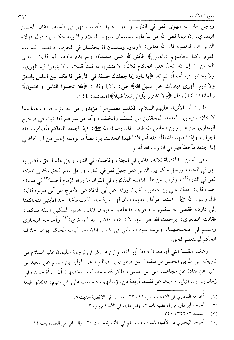 قُلْتُ: أَمَّا الْأَنْبِيَاءُ عَلَيْهِمُ السَّلَامُ، فَكُلُّهُمْ مَعْصُومُونَ مُؤَيَّدُونَ مِنَ اللَّهِ عَزَّ وَجَلَّ، وَهَذَا مِمَّا لَا خِلَافَ فِيهِ بَيْنَ الْعُلَمَاءِ الْمُحَقِّقِينَ مِنَ السَّلَفِ وَالْخَلَفِ، وَأَمَّا مَنْ سِوَاهُمْ فَقَدْ ثَبَتَ فِي صَحِيحِ الْبُخَارِيِّ عَنْ عَمْرِو بْنِ الْعَاصِ أَنَّهُ قَالَ: قَالَ رَسُولُ اللَّهِ صَلَّى اللَّهُ عَلَيْهِ وَسَلَّمَ: «إِذَا اجْتَهَدَ الْحَاكِمُ فَأَصَابَ، فَلَهُ أجران، وإذا اجتهد فأخطأ، فله أجرا» «1» فَهَذَا الْحَدِيثُ يَرُدُّ نَصًّا مَا تَوَهَّمَهُ إِيَاسٌ مِنْ أَنَّ الْقَاضِيَ إِذَا اجْتَهَدَ فَأَخَطَأَ فَهُوَ فِي النَّارِ، وَاللَّهُ أَعْلَمُ.