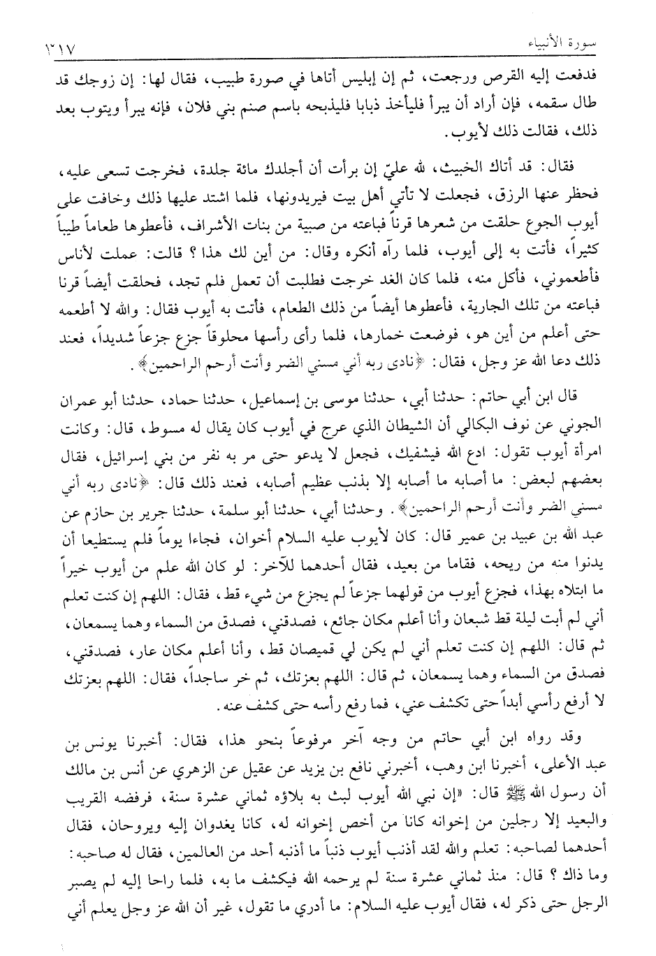 قَالَ ابْنُ أَبِي حَاتِمٍ: حَدَّثَنَا أَبِي، حَدَّثَنَا مُوسَى بْنُ إِسْمَاعِيلَ، حَدَّثَنَا حَمَّادٌ، حَدَّثَنَا أَبُو عِمْرَانَ الْجَوْنَيُّ عَنْ نَوْفٍ الْبِكَالِيِّ أَنَّ الشَّيْطَانَ الَّذِي عَرَّجَ فِي أَيُّوبَ كَانَ يُقَالُ لَهُ مسوط، قَالَ: وَكَانَتِ امْرَأَةُ أَيُّوبَ تَقُولُ: ادْعُ اللَّهَ فَيَشْفِيَكَ، فَجَعَلَ لَا يَدْعُو حَتَّى مَرَّ بِهِ نَفَرٌ مِنْ بَنِي إِسْرَائِيلَ، فَقَالَ بَعْضُهُمْ لِبَعْضٍ: مَا أَصَابَهُ إِلَّا بِذَنْبٍ عَظِيمٍ أَصَابَهُ، فَعِنْدَ ذلك قال: نَادَى رَبَّهُ أَنِّي مَسَّنِيَ الضُّرُّ وَأَنْتَ أَرْحَمُ الرَّاحِمِينَ. وَحَدَّثَنَا أَبِي، حَدَّثَنَا أَبُو سَلَمَةَ، حَدَّثَنَا جَرِيرُ بْنُ حَازِمٍ عَنْ عَبْدِ اللَّهِ بْنِ عُبَيْدِ بْنِ عُمَيْرٍ قَالَ: كَانَ لِأَيُّوبَ عَلَيْهِ السَّلَامُ أَخَوَانِ، فَجَاءَا يَوْمًا فَلَمْ يَسْتَطِيعَا أَنْ يَدْنُوَا مِنْهُ مِنْ رِيحِهِ، فَقَامَا مِنْ بَعِيدٍ، فَقَالَ أَحَدُهُمَا لِلْآخَرِ: لَوْ كَانَ اللَّهُ عَلِمَ مِنْ أَيُّوبَ خَيْرًا مَا ابْتَلَاهُ بِهَذَا، فَجَزِعَ أَيُّوبُ مِنْ قَوْلِهِمَا جَزَعًا لَمْ يَجْزَعْ مِنْ شَيْءٍ قَطُّ، فَقَالَ: اللَّهُمَّ إِنْ كُنْتَ تَعْلَمُ أَنِّي لَمْ أَبِتْ لَيْلَةً قَطُّ شَبْعَانَ وَأَنَا أَعْلَمُ مَكَانَ جَائِعٍ، فَصَدِّقْنِي، فَصُدِّقَ مِنَ السَّمَاءِ وَهُمَا يَسْمَعَانِ، ثُمَّ قَالَ: اللَّهُمَّ إِنْ كُنْتَ تَعْلَمُ أَنِّي لَمْ يَكُنْ لِي قَمِيصَانِ قَطُّ، وَأَنَا أَعْلَمُ مَكَانَ عَارٍ، فَصَدِّقْنِي، فَصُدِّقَ مِنَ السماء وهما يسمعان، ثم قال: اللهم بعزتك، ثم خر ساجدا، فقال: اللَّهُمَّ بِعِزَّتِكَ لَا أَرْفَعُ رَأْسِي أَبَدًا حَتَّى تَكْشِفَ عَنِّي، فَمَا رَفَعَ رَأْسَهُ حَتَّى كُشِفَ عَنْهُ.