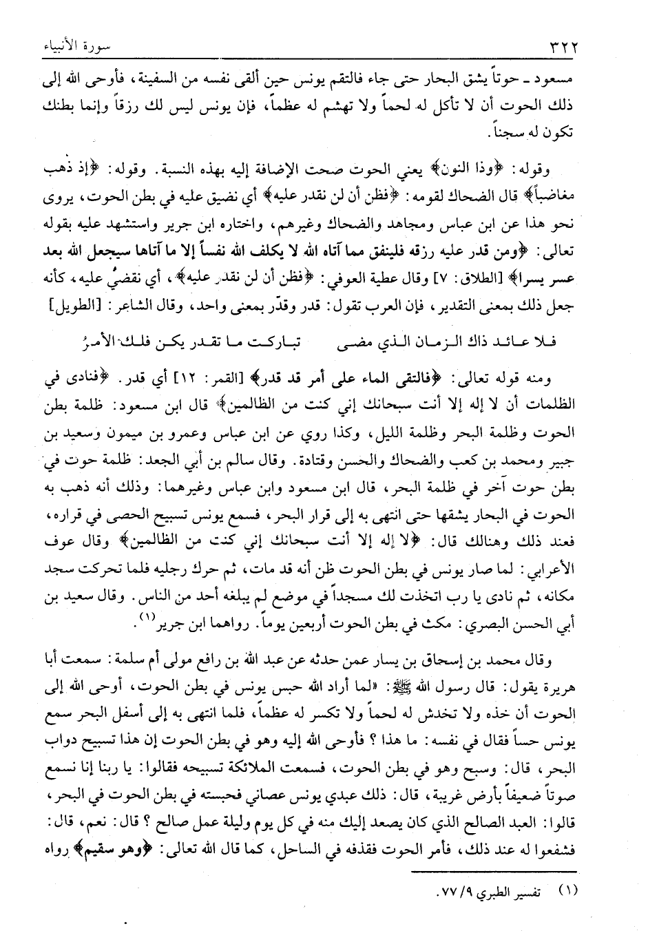 وَقَوْلُهُ: وَذَا النُّونِ يَعْنِي الْحُوتَ صَحَّتِ الْإِضَافَةُ إِلَيْهِ بِهَذِهِ النِّسْبَةِ. وَقَوْلُهُ: إِذْ ذَهَبَ مُغاضِباً قَالَ الضَّحَّاكُ لِقَوْمِهِ: فَظَنَّ أَنْ لَنْ نَقْدِرَ عَلَيْهِ أَيْ نُضَيِّقَ عَلَيْهِ فِي بَطْنِ الْحُوتِ، يُرْوَى نَحْوُ هَذَا عَنِ ابْنِ عَبَّاسٍ وَمُجَاهِدٍ وَالضَّحَّاكِ وَغَيْرِهِمْ، وَاخْتَارَهُ ابْنُ جَرِيرٍ وَاسْتَشْهَدَ عَلَيْهِ بِقَوْلِهِ تَعَالَى: وَمَنْ قُدِرَ عَلَيْهِ رِزْقُهُ فَلْيُنْفِقْ مِمَّا آتاهُ اللَّهُ لَا يُكَلِّفُ اللَّهُ نَفْساً إِلَّا مَا آتَاهَا سَيَجْعَلُ اللَّهُ بَعْدَ عُسْرٍ يُسْراً [الطَّلَاقِ: 7] وَقَالَ عَطِيَّةُ الْعَوْفِيُّ: فَظَنَّ أَنْ لَنْ نَقْدِرَ عَلَيْهِ، أَيْ نَقْضِيَ عَلَيْهِ، كَأَنَّهُ جَعَلَ ذَلِكَ بِمَعْنَى التَّقْدِيرِ، فَإِنَّ الْعَرَبَ تَقُولُ: قَدَرَ وَقَدَّرَ بِمَعْنَى وَاحِدٍ، وَقَالَ الشَّاعِرُ: [الطويل]