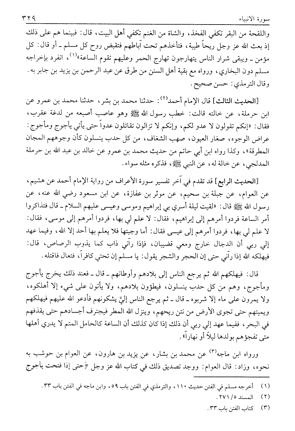وَرَوَاهُ ابْنُ مَاجَهْ «3» عَنْ مُحَمَّدِ بْنِ بَشَّارٍ، عَنْ يَزِيدَ بْنِ هَارُونَ، عَنِ الْعَوَّامِ بْنِ حَوْشَبٍ بِهِ نَحْوَهُ، وَزَادَ: قَالَ الْعَوَّامُ: وَوُجِدَ تَصْدِيقُ ذَلِكَ فِي كِتَابِ اللَّهِ عَزَّ وَجَلَّ حَتَّى إِذا فُتِحَتْ يَأْجُوجُ