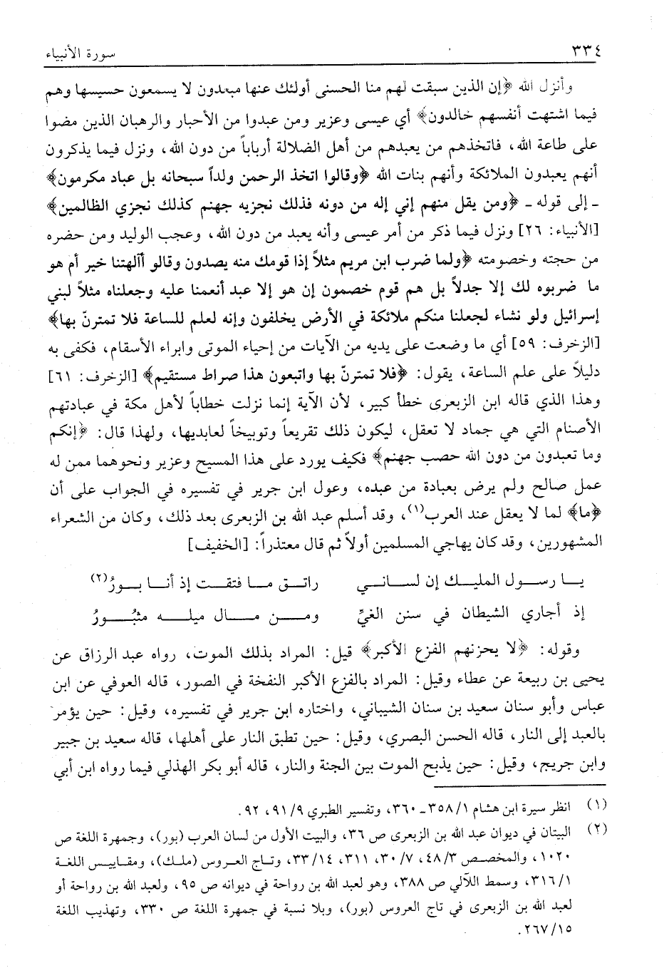 وَأَنْزَلَ اللَّهُ إِنَّ الَّذِينَ سَبَقَتْ لَهُمْ مِنَّا الْحُسْنى أُولئِكَ عَنْها مُبْعَدُونَ لا يَسْمَعُونَ حَسِيسَها وَهُمْ فِي مَا اشْتَهَتْ أَنْفُسُهُمْ خالِدُونَ أَيْ عيسى وعزيز وَمَنْ عُبِدُوا مِنَ الْأَحْبَارِ وَالرُّهْبَانِ الَّذِينَ مَضَوْا عَلَى طَاعَةِ اللَّهِ، فَاتَّخَذَهُمْ مَنْ يَعْبُدُهُمْ مِنْ أَهْلِ الضَّلَالَةِ أَرْبَابًا مِنْ دُونِ اللَّهِ، وَنَزَلَ فِيمَا يَذْكُرُونَ أَنَّهُمْ يَعْبُدُونَ الْمَلَائِكَةَ وَأَنَّهُمْ بَنَاتُ اللَّهِ وَقالُوا اتَّخَذَ الرَّحْمنُ وَلَداً سُبْحانَهُ بَلْ عِبادٌ مُكْرَمُونَ- إِلَى قَوْلِهِ- وَمَنْ يَقُلْ مِنْهُمْ إِنِّي إِلهٌ مِنْ دُونِهِ فَذلِكَ نَجْزِيهِ جَهَنَّمَ كَذلِكَ نَجْزِي الظَّالِمِينَ [الْأَنْبِيَاءِ: 26] وَنَزَلَ فِيمَا ذُكِرَ مَنْ أَمْرِ عِيسَى وَأَنَّهُ يُعْبَدُ مِنْ دُونِ اللَّهِ، وَعَجَبِ الْوَلِيدِ وَمَنْ حَضَرَهُ مِنْ حُجَّتِهِ وَخُصُومَتِهِ وَلَمَّا ضُرِبَ ابْنُ مَرْيَمَ مَثَلًا إِذا قَوْمُكَ مِنْهُ يَصِدُّونَ وَقالُوا أَآلِهَتُنا خَيْرٌ أَمْ هُوَ مَا ضَرَبُوهُ لَكَ إِلَّا جَدَلًا بَلْ هُمْ قَوْمٌ خَصِمُونَ إِنْ هُوَ إِلَّا عَبْدٌ أَنْعَمْنا عَلَيْهِ وَجَعَلْناهُ مَثَلًا لِبَنِي إِسْرائِيلَ وَلَوْ نَشاءُ لَجَعَلْنا مِنْكُمْ مَلائِكَةً فِي الْأَرْضِ يَخْلُفُونَ وَإِنَّهُ لَعِلْمٌ لِلسَّاعَةِ فَلا تَمْتَرُنَّ بِها [الزُّخْرُفِ: 59] أَيْ مَا وَضَعْتُ عَلَى يَدَيْهِ مِنَ الْآيَاتِ مِنْ إِحْيَاءِ الْمَوْتَى وَإِبْرَاءِ الْأَسْقَامِ، فَكَفَى بِهِ دَلِيلًا عَلَى عِلْمِ السَّاعَةِ، يَقُولُ: فَلا تَمْتَرُنَّ بِها وَاتَّبِعُونِ هَذَا صِراطٌ مُسْتَقِيمٌ [الزُّخْرُفِ: 61] وَهَذَا الَّذِي قَالَهُ ابْنُ الزِّبَعْرَى خَطَأٌ كَبِيرٌ، لِأَنَّ الْآيَةَ إِنَّمَا نَزَلَتْ خِطَابًا لِأَهْلِ مَكَّةَ فِي عِبَادَتِهِمُ الْأَصْنَامَ الَّتِي هِيَ جَمَادٌ لَا تَعْقِلُ، لِيَكُونَ ذَلِكَ تَقْرِيعًا وَتَوْبِيخًا لِعَابِدِيهَا، وَلِهَذَا قَالَ: إِنَّكُمْ وَما تَعْبُدُونَ مِنْ دُونِ اللَّهِ حَصَبُ جَهَنَّمَ فَكَيْفَ يورد على هذا المسيح وعزيز ونحوهما من لَهُ عَمَلٌ صَالِحٌ وَلَمْ يَرْضَ بِعِبَادَةِ مَنْ عَبَدَهُ، وَعَوَّلَ ابْنُ جَرِيرٍ فِي تَفْسِيرِهِ فِي الْجَوَابِ عَلَى أَنَّ (مَا) لِمَا لَا يَعْقِلُ عِنْدَ الْعَرَبِ «1» ، وَقَدْ أَسْلَمَ عَبْدُ اللَّهِ بْنُ الزِّبَعْرَى بَعْدَ ذَلِكَ، وَكَانَ مِنَ الشُّعَرَاءِ الْمَشْهُورِينَ، وقد كان يهاجي المسلمين أولا ثم قال معتذرا: [الخفيف]