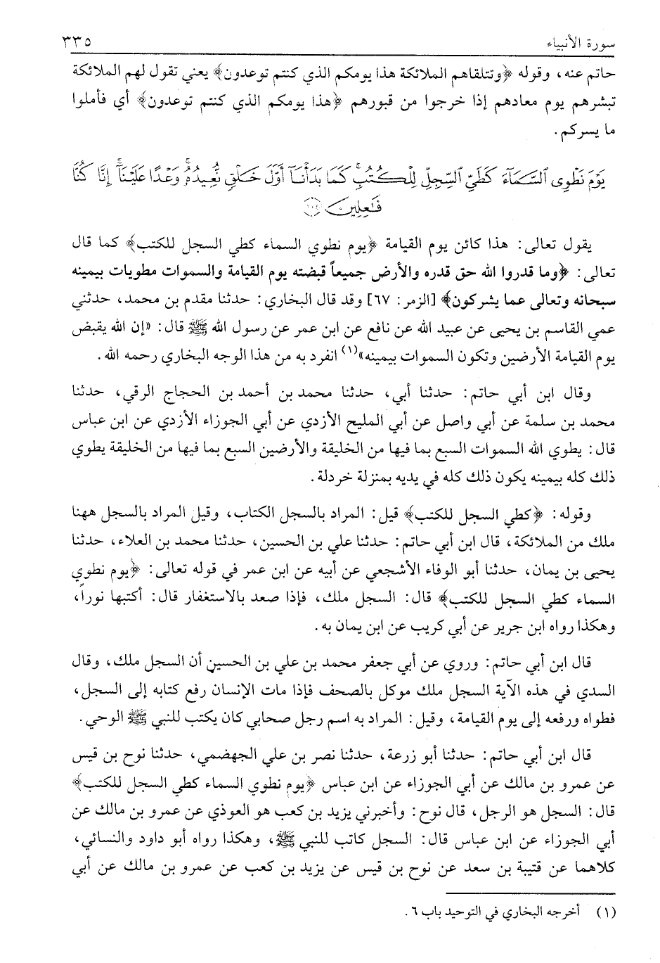 وَقَوْلُهُ: كَطَيِّ السِّجِلِّ لِلْكُتُبِ قِيلَ: الْمُرَادُ بِالسِّجِلِّ الْكِتَابُ، وَقِيلَ الْمُرَادُ بِالسِّجِلِّ هَاهُنَا مَلَكٌ مِنَ الْمَلَائِكَةِ، قَالَ ابْنُ أَبِي حَاتِمٍ: حَدَّثَنَا عَلِيُّ بْنُ الْحُسَيْنِ، حَدَّثَنَا مُحَمَّدُ بْنُ الْعَلَاءِ، حَدَّثَنَا يَحْيَى بْنُ يَمَانٍ، حَدَّثَنَا أَبُو الْوَفَاءِ الْأَشْجَعِيُّ عَنِ أَبِيهِ عَنِ ابْنِ عُمَرَ فِي قَوْلِهِ تَعَالَى: يَوْمَ نَطْوِي السَّماءَ كَطَيِّ السِّجِلِّ لِلْكُتُبِ قَالَ: السِّجِلُّ مَلَكٌ، فَإِذَا صَعِدَ بِالِاسْتِغْفَارِ قَالَ: اكْتُبْهَا نُورًا، وَهَكَذَا رَوَاهُ ابْنُ جَرِيرٍ عَنْ أَبِي كُرَيْبٍ عَنِ ابْنِ يَمَانٍ بِهِ.