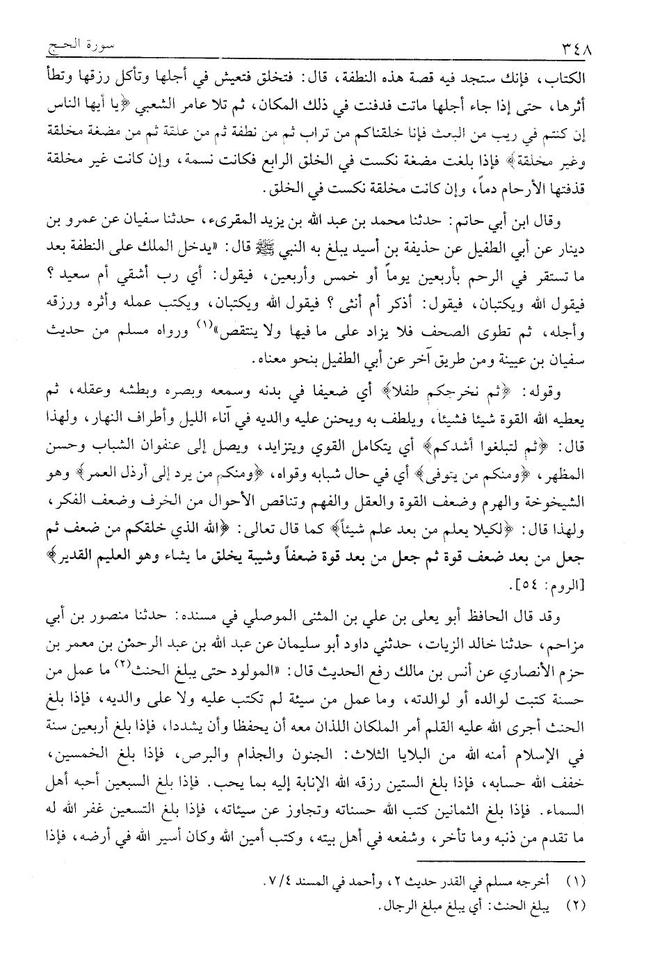 الْكِتَابِ، فَإِنَّكَ سَتَجِدُ فِيهِ قِصَّةَ هَذِهِ النُّطْفَةِ، قَالَ: فَتُخْلَقُ فَتَعِيشُ فِي أَجَلِهَا وَتَأْكُلُ رِزْقَهَا وَتَطَأُ أَثَرَهَا، حَتَّى إِذَا جَاءَ أَجَلُهَا مَاتَتْ فَدُفِنَتْ فِي ذَلِكَ الْمَكَانِ، ثُمَّ تَلَا عَامِرٌ الشَّعْبِيُّ يَا أَيُّهَا النَّاسُ إِنْ كُنْتُمْ فِي رَيْبٍ مِنَ الْبَعْثِ فَإِنَّا خَلَقْناكُمْ مِنْ تُرابٍ ثُمَّ مِنْ نُطْفَةٍ ثُمَّ مِنْ عَلَقَةٍ ثُمَّ مِنْ مُضْغَةٍ مُخَلَّقَةٍ وَغَيْرِ مُخَلَّقَةٍ فَإِذَا بَلَغَتْ مُضْغَةً نُكِّسَتْ فِي الْخَلْقِ الرَّابِعِ فَكَانَتْ نَسَمَةً، وإن كَانَتْ غَيْرَ مُخَلَّقَةٍ قَذَفَتْهَا الْأَرْحَامُ دَمًا، وَإِنْ كَانَتْ مُخَلَّقَةً نُكِّسَتْ فِي الْخَلْقِ.
