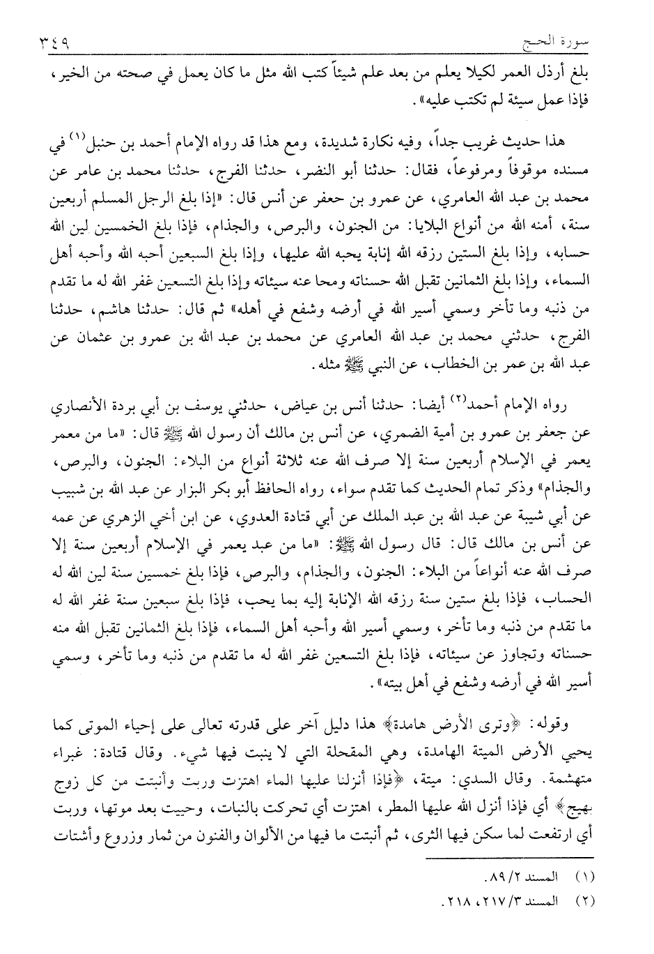 هَذَا حَدِيثٌ غَرِيبٌ جِدًّا، وَفِيهِ نَكَارَةٌ شَدِيدَةٌ، وَمَعَ هَذَا قَدْ رَوَاهُ الْإِمَامُ أَحْمَدُ بْنُ حَنْبَلٍ «1» فِي مُسْنَدِهِ موقوفا ومرفوعا، فَقَالَ: حَدَّثَنَا أَبُو النَّضْرِ، حَدَّثَنَا الْفَرَجُ، حَدَّثَنَا مُحَمَّدُ بْنُ عَامِرٍ عَنْ مُحَمَّدِ بْنِ عَبْدِ اللَّهِ الْعَامِرِيِّ، عَنْ عَمْرِو بْنِ جَعْفَرٍ عَنْ أَنْسٍ قَالَ: «إِذَا بَلَغَ الرَّجُلُ الْمُسْلِمُ أَرْبَعِينَ سَنَةً، أَمَّنَهُ اللَّهُ مِنْ أَنْوَاعِ الْبَلَايَا: مِنَ الجنون، والبرص، والجذام، فَإِذَا بَلَغَ الْخَمْسِينَ لَيَّنَ اللَّهُ حِسَابَهُ، وَإِذَا بلغ الستين رزقه الله إنابة يحبه الله عَلَيْهَا، وَإِذَا بَلَغَ السَّبْعِينَ أَحَبَّهُ اللَّهُ وَأَحَبَّهُ أَهْلُ السَّمَاءِ، وَإِذَا بَلَغَ الثَّمَانِينَ تَقَبَّلَ اللَّهُ حَسَنَاتِهِ وَمَحَا عَنْهُ سَيِّئَاتِهِ وَإِذَا بَلَغَ التِّسْعِينَ غَفَرَ اللَّهُ لَهُ مَا تَقَدَّمَ مِنْ ذَنْبِهِ وَمَا تَأَخَّرَ وَسُمِّيَ أَسِيرَ اللَّهِ فِي أَرْضِهِ وَشُفِّعَ فِي أَهْلِهِ» ثُمَّ قَالَ: حَدَّثَنَا هَاشِمٌ، حَدَّثَنَا الْفَرَجُ، حَدَّثَنِي مُحَمَّدُ بْنُ عَبْدِ اللَّهِ الْعَامِرِيُّ عَنْ مُحَمَّدِ بْنِ عَبْدِ اللَّهِ بْنِ عَمْرِو بْنِ عُثْمَانَ عَنْ عَبْدِ اللَّهِ بْنِ عُمَرَ بْنِ الْخَطَّابِ، عَنِ النَّبِيِّ صَلَّى اللَّهُ عَلَيْهِ وَسَلَّمَ مِثْلَهُ.