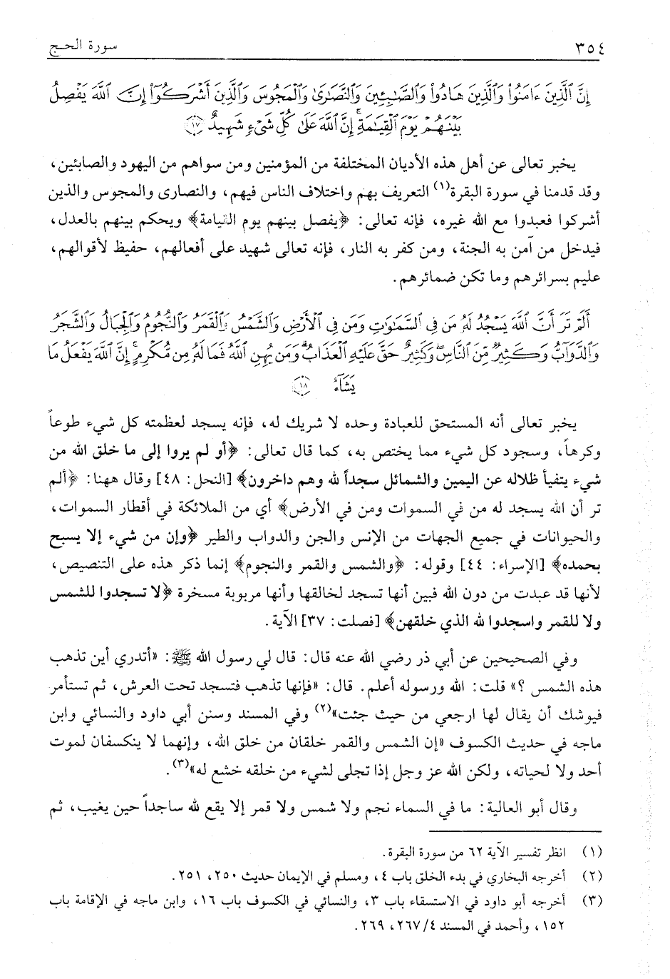 أَلَمْ تَرَ أَنَّ اللَّهَ يَسْجُدُ لَهُ مَنْ فِي السَّماواتِ وَمَنْ فِي الْأَرْضِ وَالشَّمْسُ وَالْقَمَرُ وَالنُّجُومُ وَالْجِبالُ وَالشَّجَرُ وَالدَّوَابُّ وَكَثِيرٌ مِنَ النَّاسِ وَكَثِيرٌ حَقَّ عَلَيْهِ الْعَذابُ وَمَنْ يُهِنِ اللَّهُ فَما لَهُ مِنْ مُكْرِمٍ إِنَّ اللَّهَ يَفْعَلُ مَا يَشاءُ (18)