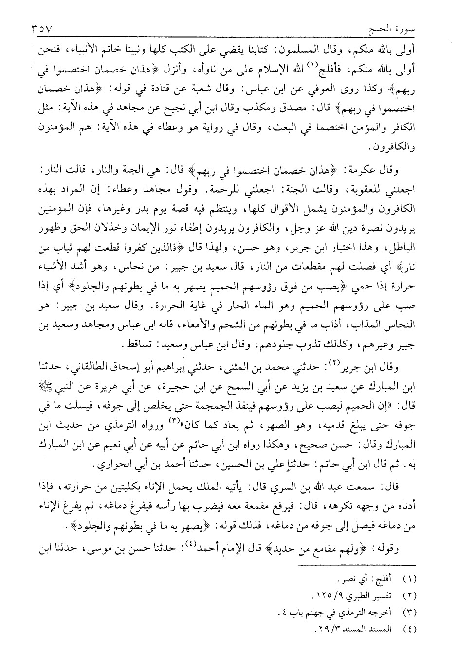 اجْعَلْنِي لِلْعُقُوبَةِ، وَقَالَتِ الْجَنَّةُ: اجْعَلْنِي لِلرَّحْمَةِ. وَقَوْلُ مُجَاهِدٍ وَعَطَاءٍ: إِنَّ الْمُرَادَ بِهَذِهِ الْكَافِرُونَ وَالْمُؤْمِنُونَ يَشْمَلُ الْأَقْوَالَ كُلَّهَا، وَيَنْتَظِمُ فِيهِ قِصَّةُ يَوْمِ بَدْرٍ وَغَيْرُهَا، فَإِنَّ المؤمنين يريدون نصرة دين الله عز وجل، وَالْكَافِرُونَ يُرِيدُونَ إِطْفَاءَ نُورِ الْإِيمَانِ وَخُذْلَانَ الْحَقِّ وَظُهُورَ الْبَاطِلِ، وَهَذَا اخْتِيَارُ ابْنِ جَرِيرٍ، وَهُوَ حَسَنٌ، وَلِهَذَا قَالَ فَالَّذِينَ كَفَرُوا قُطِّعَتْ لَهُمْ ثِيابٌ مِنْ نارٍ أَيْ فُصِّلَتْ لَهُمْ مُقَطَّعَاتٌ من النار، قَالَ سَعِيدُ بْنُ جُبَيْرٍ: مِنْ نُحَاسٍ، وَهُوَ أَشَدُّ الْأَشْيَاءِ حَرَارَةً إِذَا حَمِيَ يُصَبُّ مِنْ فَوْقِ رُؤُسِهِمُ الْحَمِيمُ يُصْهَرُ بِهِ مَا فِي بُطُونِهِمْ وَالْجُلُودُ أي إذا صب على رؤوسهم الْحَمِيمُ وَهُوَ الْمَاءُ الْحَارُّ فِي غَايَةِ الْحَرَارَةِ. وَقَالَ سَعِيدُ بْنُ جُبَيْرٍ: هُوَ النُّحَاسُ الْمُذَابُ، أَذَابَ مَا فِي بُطُونِهِمْ مِنَ الشَّحْمِ وَالْأَمْعَاءِ، قَالَهُ ابْنُ عَبَّاسٍ وَمُجَاهِدٌ وَسَعِيدُ بْنُ جُبَيْرٍ وَغَيْرُهُمْ، وَكَذَلِكَ تَذُوبُ جُلُودُهُمْ، وَقَالَ ابْنُ عَبَّاسٍ وَسَعِيدٌ: تَسَاقَطَ.