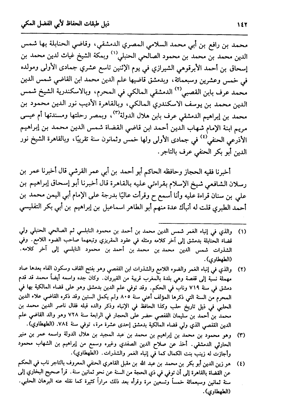 1 والذي في إنباء الغمر شمس الدين محمد بن أحمد بن محمود النابلسي ثم الصالحي الحنبلي ولي قضاء الحنابلة بدمشق إلى آخر كلامه ومثله في عقود المقريزي وتبعهما صاحب الضوء اللامع. وفي الشذرات شمس الدين محمد بن محمد بن أحمد بن محمود النابلسي إلى آخر كلامه. "الطهطاوي".