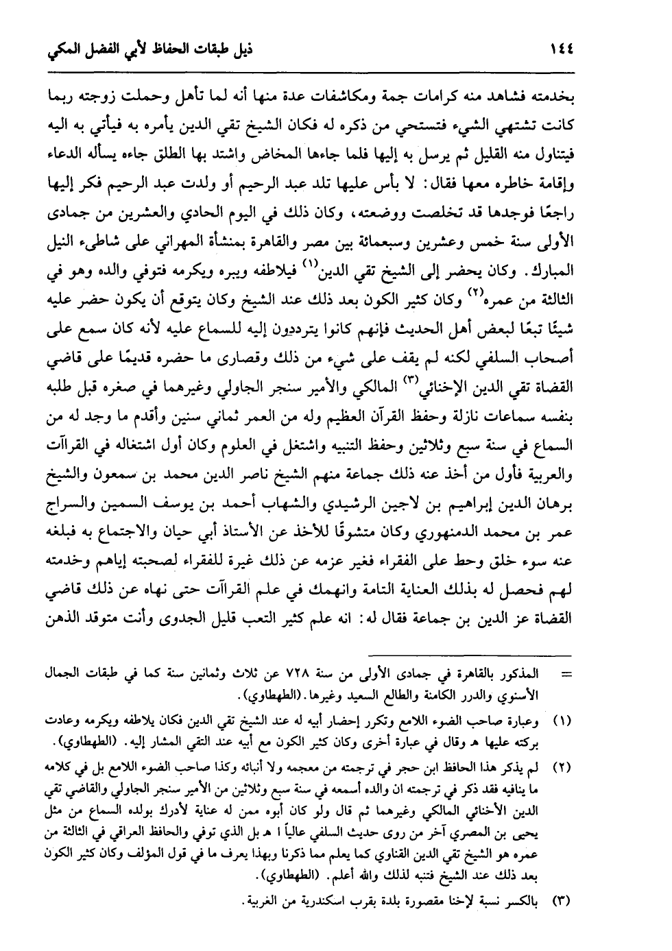 1 وعبارة صاحب الضوء اللامع وتكرر إحضار أبيه له عند الشيخ تقي الدين فكان يلاطفه ويكرمه وعادت بركته عليها. اهـ. وقال في عبارة أخرى: وكان كثير الكون مع أبيه عند التقي المشار إليه. "الطهطاوي".