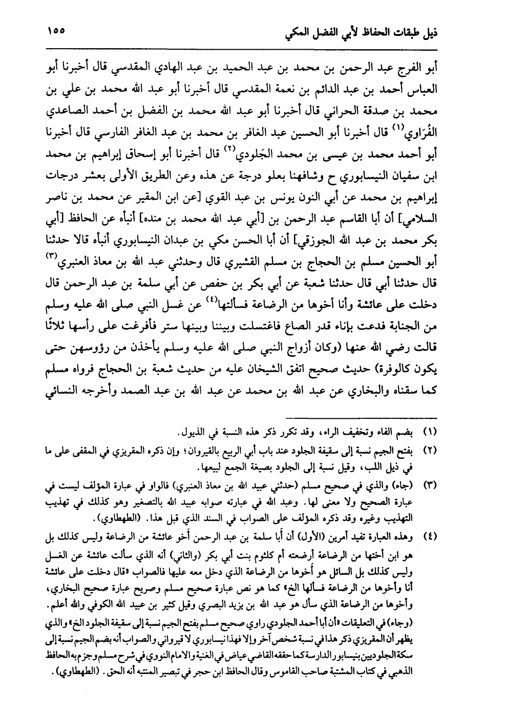 4 وهذه العبارة تفيد أمرين "الأول" أن أبا سلمة بن عبد الرحمن أخو عائشة من الرضاعة وليس كذلك بل هو ابن أختها من الرضاعة أرضعته أم كلثوم بنت أبي بكر "والثاني" أنه الذي سأل عائشة عن الغسل وليس كذلك بل السائل هو أخوها من الرضاعة الذي دخل معه عليها فالصواب "قال: دخلت على عائشة أنا وأخوها من الرضاعة فسألها ... إلخ" كما هو نص عبارة صحيح مسلم وصحيح البخاري، وأخوها من الرضاعة الذي سأل هو عبد الله بن يزيد البصري وقيل كثير بن عبيد الله الكوفي والله أعلم. "وجاء" في التعليقات "أن أبا أحمد الجلودي راوي صحيح مسلم بفتح الجيم نسبة إلى سقيفة الجلود ... إلخ" والذي يظهر أن المقريزي ذكر هذا في نسبة شخص آخر وإلا فهذا نيسابوري لا قيرواني والصواب أنه بضم الجيم نسبة إلى سكة الجلوديين بنيسابور الدارسة كما حققه القاضي عياض في الغنية والإمام النووي في شرح مسلم وجزم به الحافظ الذهبي في كتاب المشتبه صاحب القاموس وقال الحافظ ابن حجر في تبصير المنتبه: إنه الحق. "الطهطاوي".