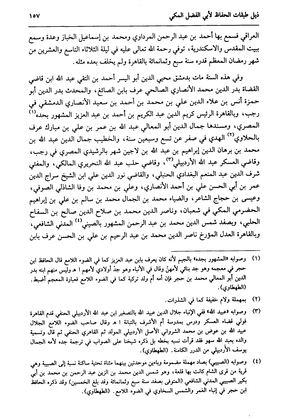 1 وصوابه "المشهور بجده" بالجيم لأنه كان يعرف بابن عبد العزيز كما في الضوء اللامع قال الحافظ ابن حجر في معجمه: وهو جد بنائي لأمهن وقال في الإنباء: وهو جد أولادي لأمهم. اهـ. وليس منهم ابنه بدر الدين أبو المعالي محمد بن حجر؛ فإن أمه أم ولد تركية كما في الضوء اللامع فعبارة المعجم أضبط. "الطهطاوي".