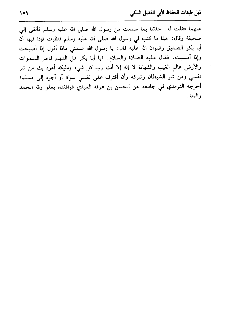 عنهما- فقلت له: حدثنا بما سمعت من رسول الله -صلى الله عليه وسلم- فألقى إليّ صحيفة وقال: هذا ما كتب لي رسول الله -صلى الله عليه وسلم- فنظرت فإذا فيها: "أن أبا بكر الصديق -رضوان الله عليه- قال: يا رسول الله علمني ماذا أقول إذا أصبحت وإذا أمسيت. فقال -عليه الصلاة والسلام: "يا أبا بكر، قل: اللهم فاطر السموات والأرض عالم الغيب والشهادة لا إله إلا أنت رب كل شيء ومليكه أعوذ بك من شر نفسي ومن شر الشيطان وشركه، وأن أقترف على نفسي سوءًا أو أجره إلى مسلم" أخرجه الترمذي في جامعه عن الحسن بن عرفة العبدي فوافقناه بعلو ولله الحمد والمنة.