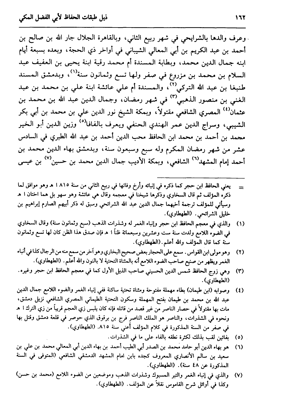 7 والذي في إنباء الغمر والتبر المسبوك وشذرات الذهب وموضعين من الضوء اللامع "محمد بن حسن" وكذا في أوائل شرح القاموس نقلًا عن المؤلف. "الطهطاوي".