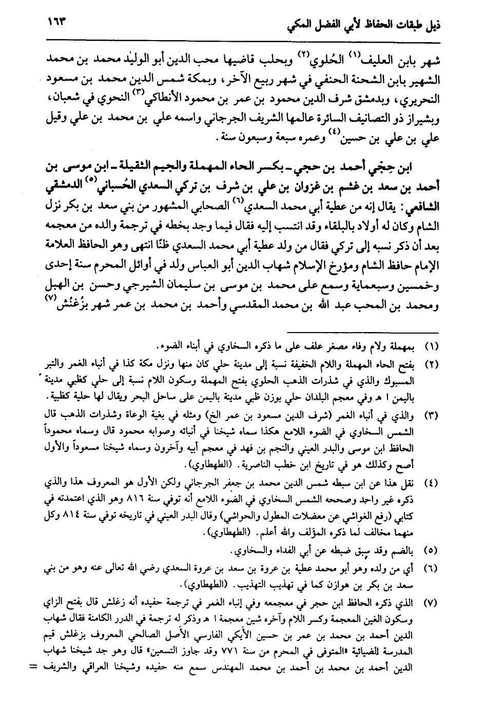 2 بفتح الحاء المهملة واللام الخفيفة نسبة إلى مدينة حلي كان منها ونزل مكة كذا في إنباء الغمر والتبر المسبوك والذي في شذرات الذهب الحلوي بفتح المهملة وسكون اللام نسبة إلى حلي كظبي مدينة باليمن. اهـ. وفي معجم البلدان حلي بوزن ظبي مدينة باليمن على ساحل البحر ويقال لها: حلية كظبية.