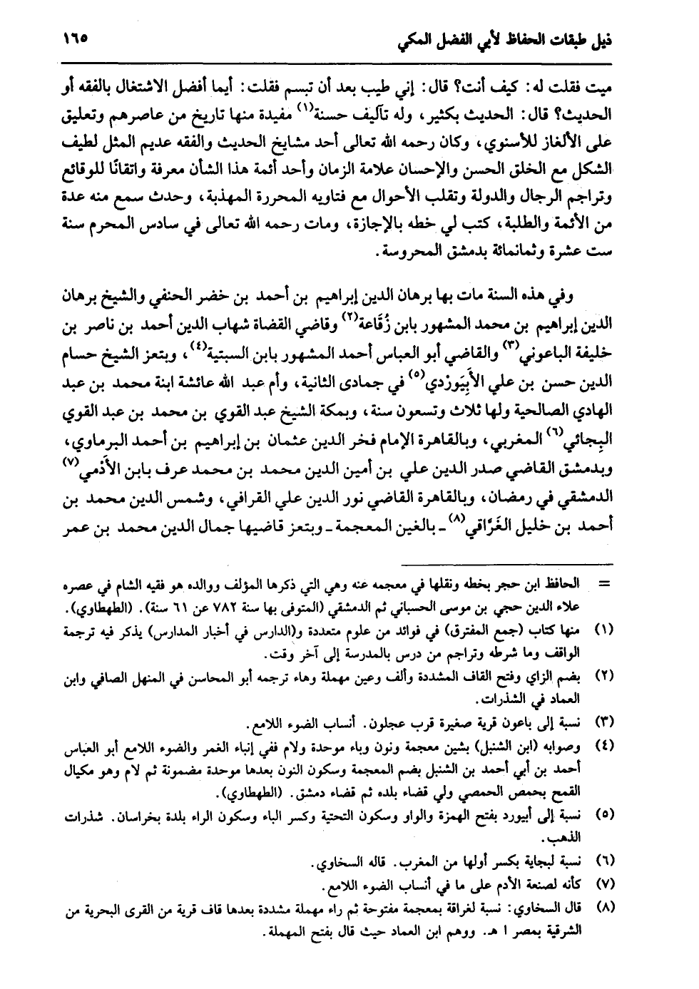 ميت فقلت له: كيف أنت؟ قال: إني طيب، بعد أن تبسم، فقلت: أيما أفضل الاشتغال بالفقه أو الحديث؟ قال: الحديث بكثير، وله تآليف حسنة1 مفيدة منها تاريخ من عاصرهم وتعليق على الألغاز للإسنوي، وكان -رحمه الله تعالى- أحد مشايخ الحديث والفقه عديم المثل لطيف الشكل مع الخلق الحسن والإحسان علامة الزمان وأحد أئمة هذا الشأن معرفة وإتقانا للوقائع وتراجم الرجال والدولة وتقلب الأحوال مع فتاويه المحررة المهذبة، وحدث سمع منه عدة من الأئمة والطلبة، كتب لي خطه بالإجازة، ومات -رحمه الله تعالى- في سادس المحرم سنة ست عشرة وثمانمائة بدمشق المحروسة.