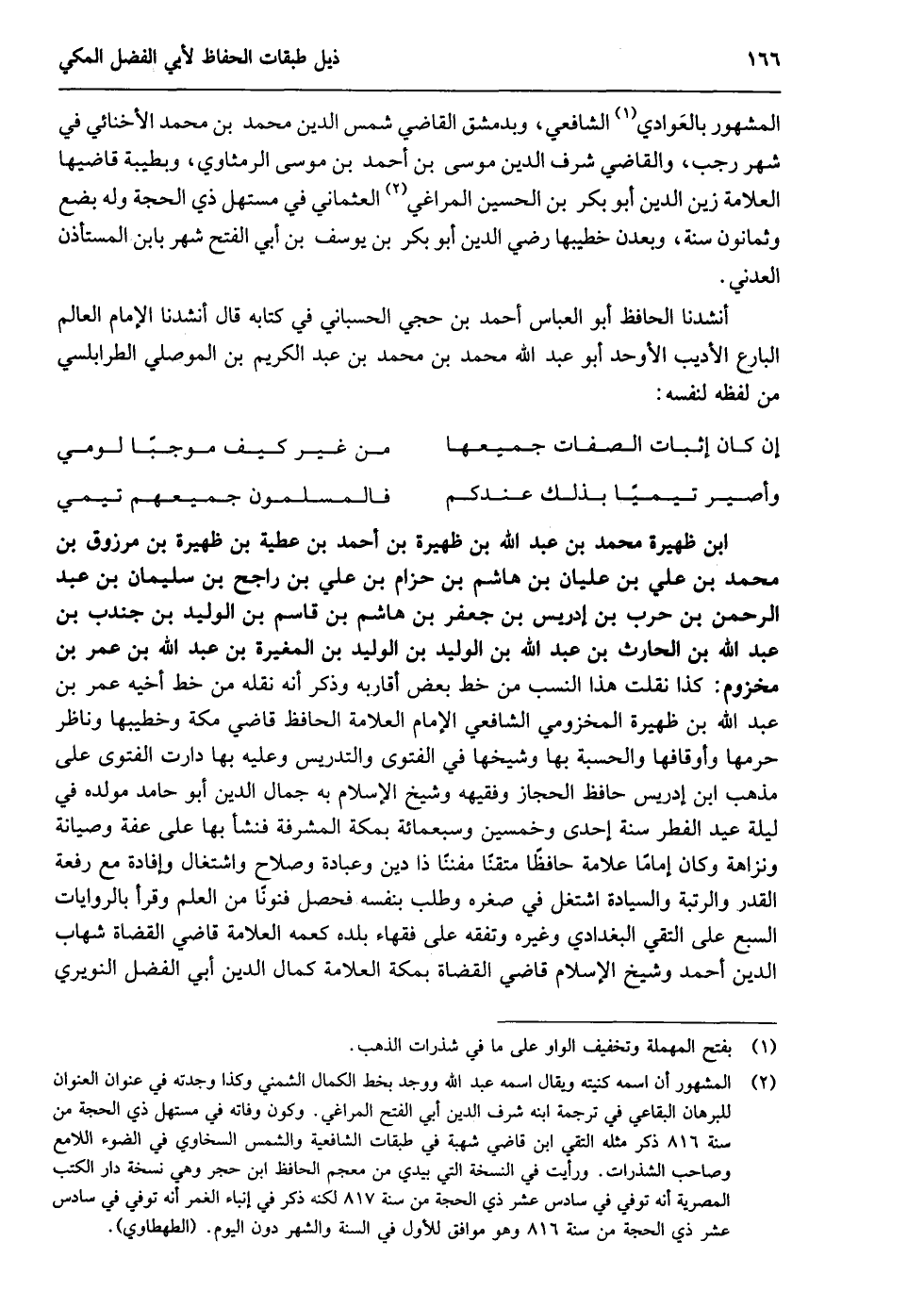 2 المشهور أن اسمه كنيته ويقال: اسمه عبد الله ووجد بخط الكمال الشمني وكذا وجدته في عنوان العنوان للبرهان البقاعي في ترجمة ابنه شرف الدين أبي الفتح المراغي. وكون وفاته في مستهل ذي الحجة من سنة 816 ذكر مثله التقي ابن قاضي شهبة في طبقات الشافعية والشمس السخاوي في الضوء اللامع وصاحب الشذرات. ورأيت في النسخة التي بيدي من معجم الحافظ ابن حجر وهي نسخة دار الكتب المصرية أنه توفي في سادس عشر من ذي الحجة من سنة 817 لكنه ذكر في إنباء الغمر أنه توفي في سادس عشر من ذي الحجة من سنة 816 وهو موافق للأول في السنة والشهر دون اليوم. "الطهطاوي".
