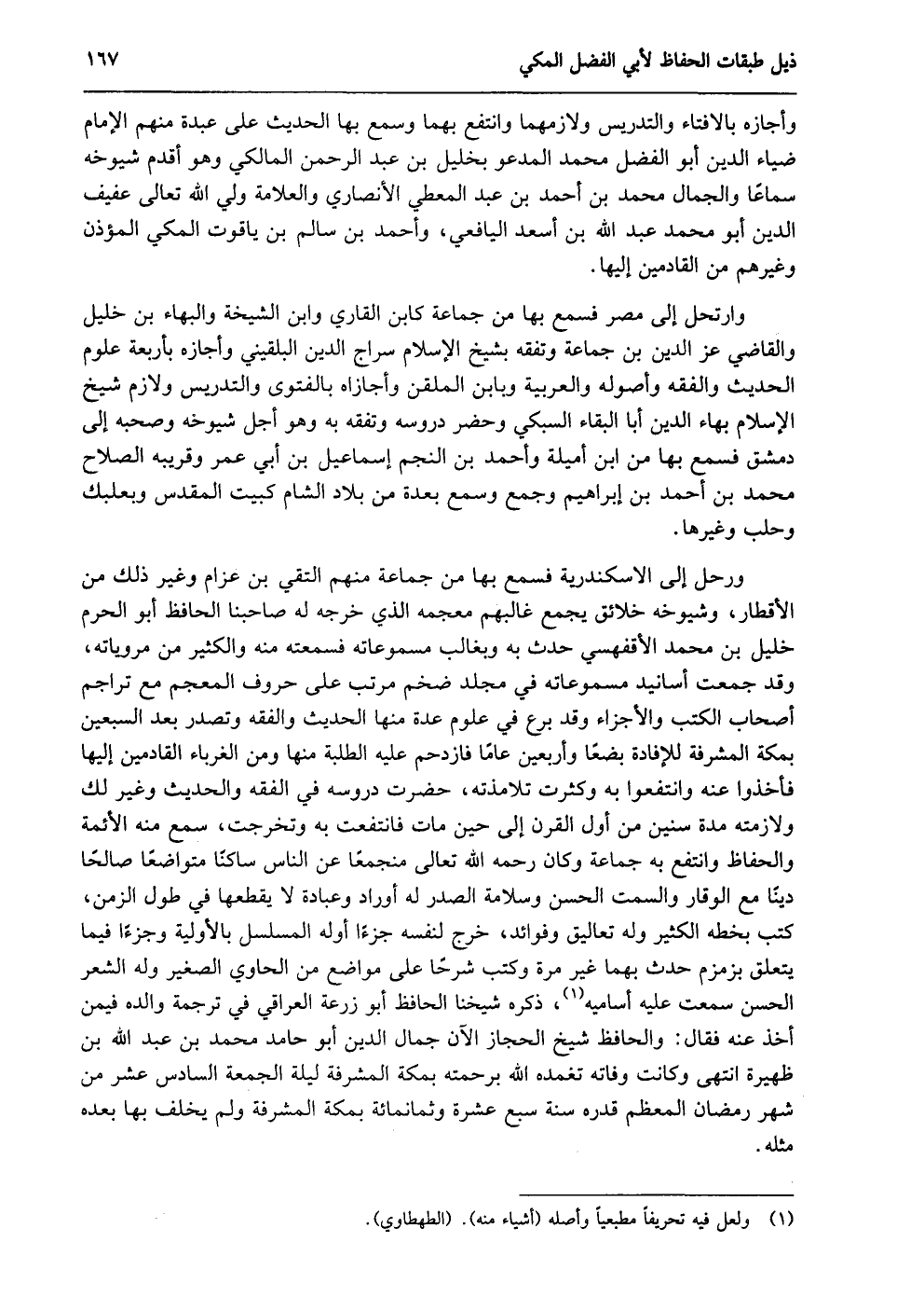 ورحل إلى الإسكندرية فسمع بها من جماعة منهم التقي بن عزام وغير ذلك من الأقطار، وشيوخه خلائق يجمع غالبهم معجمه الذي خرجه له صاحبنا الحافظ أبو الحرم خليل بن محمد الأقفهسي حدث به وبغالب مسموعاته فسمعته منه والكثير من مروياته، وقد جمعت أسانيد مسموعاته في مجلد ضخم مرتب على حروف المعجم مع تراجم أصحاب الكتب والأجزاء وقد برع في علوم عدة منها الحديث والفقه وتصدر بعد السبعين بمكة المشرفة للإفادة بضعا وأربعين عاما فازدحم عليه الطلبة منها ومن الغرباء القادمين إليها فأخذوا عنه وانتفعوا به وكثرت تلامذته، حضرت دروسه في الفقه والحديث وغير ذلك ولازمته مدة سنين من أول القرن إلى حين مات فانتفعت به وتخرجت، سمع منه الأئمة والحفاظ وانتفع به جماعة وكان -رحمه الله تعالى- منجمعا عن الناس ساكنا متواضعا صالحا دينا مع الوقار والسمت الحسن وسلامة الصدر له أوراد وعبادة لا يقطعها في طول الزمن، كتب بخطه الكثير وله تعاليق وفوائد، خرج لنسفه جزءا أوله المسلسل بالأولية وجزءا فيما يتعلق بزمزم حدث بهما غير مرة وكتب شرحا على مواضع من الحاوي الصغير وله الشعر الحسن سمعت عليه أساميه1، ذكره شيخنا الحافظ أبو زرعة العراقي في ترجمة والده فيمن أخذ عنه فقال: والحافظ شيخ الحجاز الآن جمال الدين أبو حامد محمد بن عبد الله بن ظهيرة انتهى وكانت وفاته تغمده الله برحمته بمكة المشرفة ليلة الجمعة السادس عشر من شهر رمضان المعظم قدره سنة سبع عشرة وثمانمائة بمكة المشرفة ولم يخلف بها بعده مثله.
