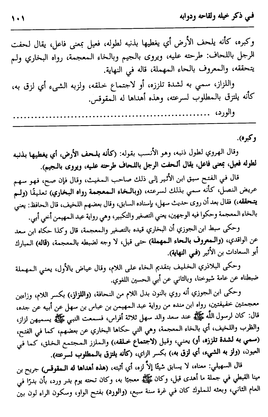 وحكى ابن الجوزي أنه روي بالنون بدل اللام من النحافة، "واللزاز" بكسر اللام وزاءين معجمتين خفيفتين، رواه ابن منده من رواية عبد المهيمن بن عباس بن سهل عن أبيه عن جده، قال: كان لرسول الله -صلى الله عليه وسلم- عند سعد والد سهل ثلاثة أفراس، فسمعت النبي -صلى الله عليه وسلم- يسميهنّ: لزاز والظرب واللخيف، أي: بالخاء المعجمة، وهي التي حكاها البخاري عن بعضهم، كما في الفتح: "سمي به لشدة تلززه، أو" يعني، وقيل: "لاجتماع خلقه", والملزز المجتمع الخلق، كما في العيون، "ولزبه الشيء، أي: لزق به" بكسر الزاي؛ "كأنَّه يلتزق بالمطلوب لسرعته".