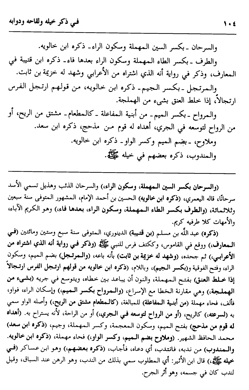 "ذكره" عبد الله بن مسلم "بن قتيبة" الدينوري، المتوفَّى سنة سبع وستين ومائتين "في المعارف" ووقع في القاموس: وككتف فرس للنبي -صلى الله عليه وسلم, "وذكر في رواية أنه الذي اشتراه من الأعرابي" ثم جحده، "وشهد له خزيمة بن ثابت" بأنه باعه، "والمرتجل" بضم الميم وسكون الراء وفتح الفوقية و"بكسر الجيم" وباللام "ذكره ابن خالويه من قولهم: ارتجل الفرس ارتجالًا إذا خلط العنق" بفتح المهملة والنون, أن يباعد بين خطاه ويتوسّع في جريه "بشيء من الهملجة" وهي مقاربة الخطا مع الإسراع، "والمرواح بكسر الميم" وإسكان الراء, فواو، فألف، فحاء مهملة "من أبنية المفاعلة" للمبالغة "كالمطعام, مشتق من الريح" وأصله الواو, سُمِّيَ به "لسرعته" كالريح، "أو من الرواح لتوسعه في الجري" أو من الراحة؛ لأنه يستراح به. "أهداه له قوم من مذحج" بفتح الميم، وسكون المعجمة، وكسر المهملة، وجيم، "ذكره ابن سعد" محمد الحافظ الشهير. "وملاوح -بضم الميم، وكسر الواو،" فحاء مهملة، "ذكره ابن خالويه. والمندوب" من ندبه فانتدب، أي: دعاه فأجاب، "ذكره بعضهم،" وهو ابن عساكر في خيله -صلى الله عليه وسلم" قال ابن الأثير: أي: المطلوب, سُمِّيَ بذلك من الندب، وهو الرهن عند السباق، وقيل: لندب كان في جسمه، وهو أثر الجرح.