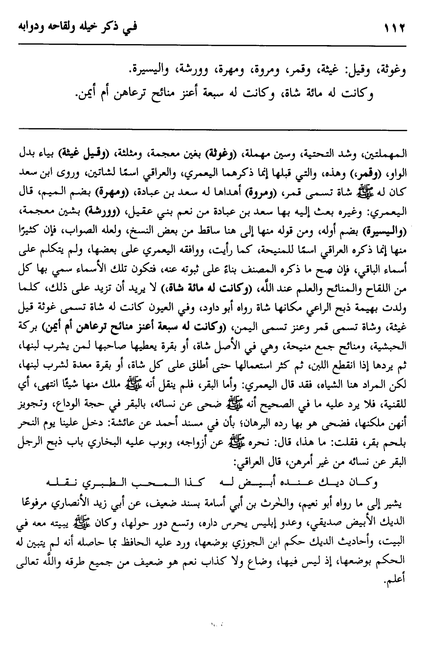 المهملتين، وشد التحتية، وسين مهملة، و"وغوثة" بغين معجمة"، ومثلثة، و"قيل: غيثة" بياء بدل الواو، "وقمر" وهذه والتي قبلها إنما ذكرهما اليعمري والعراقي اسمًا لشاتين، وروى ابن سعد: كان له -صلى الله عليه وسلم- شاة تسمَّى قمر، "ومروة" أهداها له سعد بن عبادة، "ومهرة" بضم الميم، قال اليعمري وغيره: بعث إليه بها سعد بن عبادة من نعم بني عقيل، "وورشة" بشين معجمة، "واليسيرة" بضم أوله، ومن قوله: منها إلى هنا, ساقط من بعض النسخ، ولعله الصواب، فإن كثيرًا منها إنما ذكره العراقي اسمًا للمنيحة، كما رأيت، ووافقه اليعمري على بعضها، ولم يتكلم على أسماء الباقي، فإن صحَّ ما ذكره المصنف بناءً على ثبوته عنه، فتكون تلك الأسماء سُمِّيَ بها كلٌّ من اللقاح والمنائح, والعلم عند الله. "وكانت له مائة شاة" لا يريد أن تزيد على ذلك، كلما ولدت بهيمة ذبح الراعي مكانها شاة, رواه أبو داود، وفي العيون: كانت له شاة تسمَّى غوثة, وقيل: غيثة، وشاة تسمَّى قمر, وعنز تسمَّى اليمن، "وكانت له سبة أعنز منائح ترعاهن أم أيمن" بركة الحبشية، ومنائح جمع منيحة، وهي في الأصل شاة، أو بقرة يعطيها صاحبها لمن يشرب لبنها، ثم يردّا إذا انقطع اللبن، ثم كثر استعمالها حتى أطلق على كل شاة، أو بقرة معدَّة لشرب لبنها، لكن المراد هنا الشياه، فقد قال اليعمري: وأمَّا البقر، فلم ينقل أنه -صلى الله عليه وسلم- ملك منها شيئًا. انتهى، أي: للقنية، فلا يرد عليه ما في الصحيح أنه -صلى الله عليه وسلم- ضحَّى عن نسائه بالبقر في حجة الوداع، وتجويز أنهنّ ملكنها، فضحَّى هو بها, رده البرهان بأن في مسند أحمد عن عائشة: دخل علينا يوم النحر بلحم بقر، فقلت: ما هذا، قال: نحره -صلى الله عليه وسلم- عن أزواجه، وبوّب عليه البخاري: باب ذبح الرجل البقر عن نسائه من غير أمرهنَّ، قال العراقي: