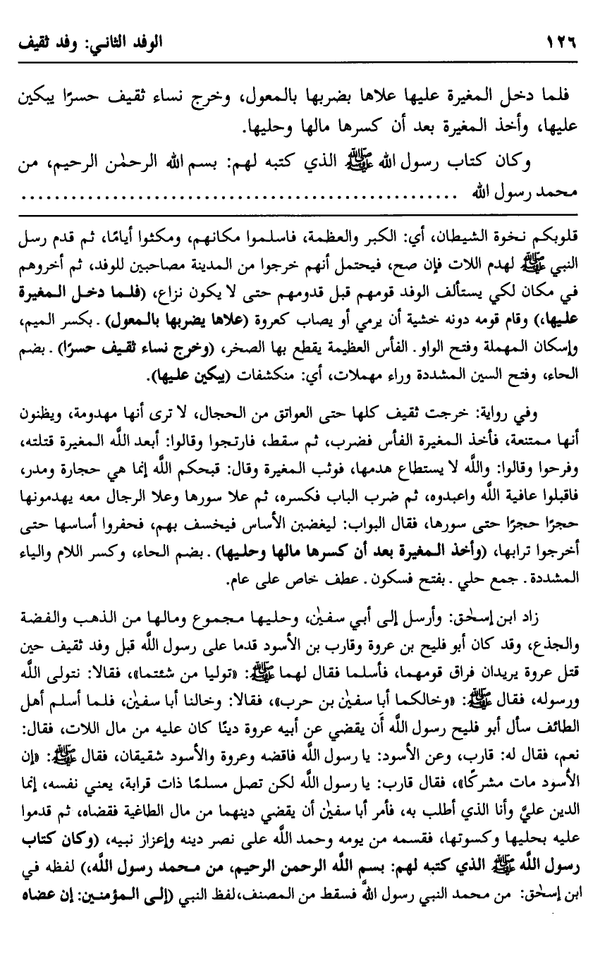 زاد ابن إسحاق: وأرسل إلى أبي سفيان حليها -مجموع, ومالها من الذهب والفضة والجذع، وقد كان أبو فليح بن عروة وقارب بن الأسود قدما على رسول الله قبل وفد ثقيف حين قتل عروة يريدان فراق قومهما، فأسلما, فقال لهما -صلى الله عليه وسلم: "توليا من شئتما"، فقالا: نتولّى الله ورسوله، فقال -صلى الله عليه وسلم: "وخالكما أبا سفيان بن حرب"، فقالا: وخالنا أبا سفيان، فلما أسلم أهل الطائف, سأل أبو فليح رسول الله أن يقضي عن أبيه عروة دينًا كان عليه من مال اللات، فقال: "نعم"، فقال له: قارب، وعن الأسود: يا رسول الله, فاقضه, وعروة والأسود شقيقان، فقال -صلى الله عليه وسلم: "إن الأسود مات مشركًا"، فقال قارب: يا رسول الله, لكن تصل مسلمًا ذات قرابة، يعني: نفسه، إنما الدَّيْن عليَّ, وأنا الذي أطلب به، فأمر أبا سفيان أن يقضي دينهما من مال الطاغية فقضاه، ثم قدموا عليه بحليها وكسوتها، فقسمه من يومه, وحمد الله على نصر دينه وإعزاز نبيه، "وكان كتاب رسول الله -صلى الله عليه وسلم- الذي كتبه لهم: "بسم الله الرحمن الرحيم، من محمد رسول الله" لفظه في ابن إسحاق: "من محمد النبي رسول الله" , فسقط من المصنف لفظ النبي, "إلى المؤمنين: إن عضاه
