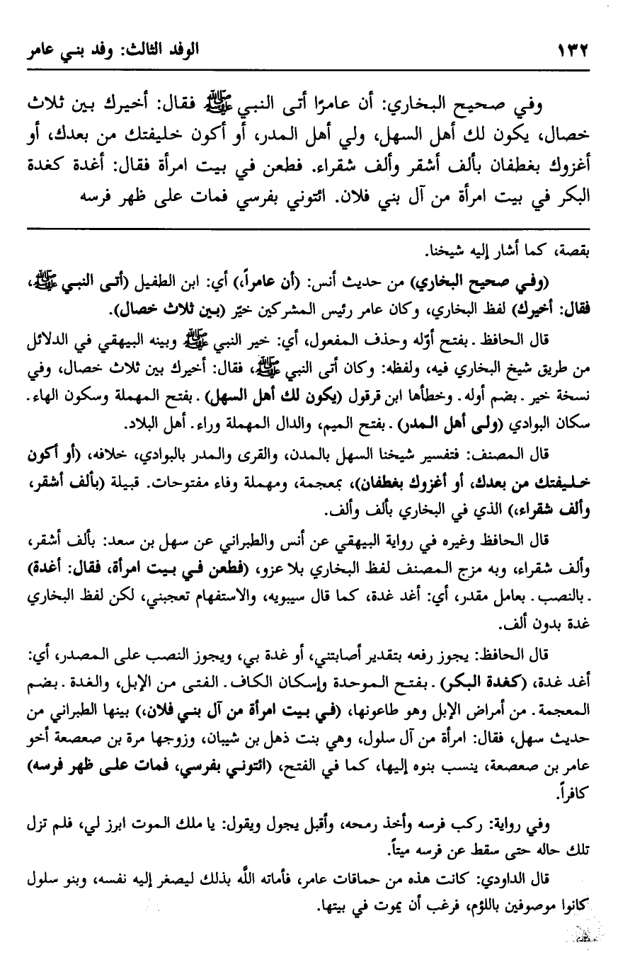 وفي صحيح البخاري: أن عامرًا أتى النبي -صلى الله عليه وسلم- فقال: أخيرك بين ثلاث خصال، يكون لك أهل السهل، ولي أهل المدر، أو أكون خليفتك من بعدك، أو أغزوك بغطفان بألف أشقر وألف شقراء. فطُعِنَ في بيت امرأة, فقال: أغدة كغدة البكر في بيت امرأة من آل بني فلان. ائتوني بفرسي, فمات على ظهر فرسه.