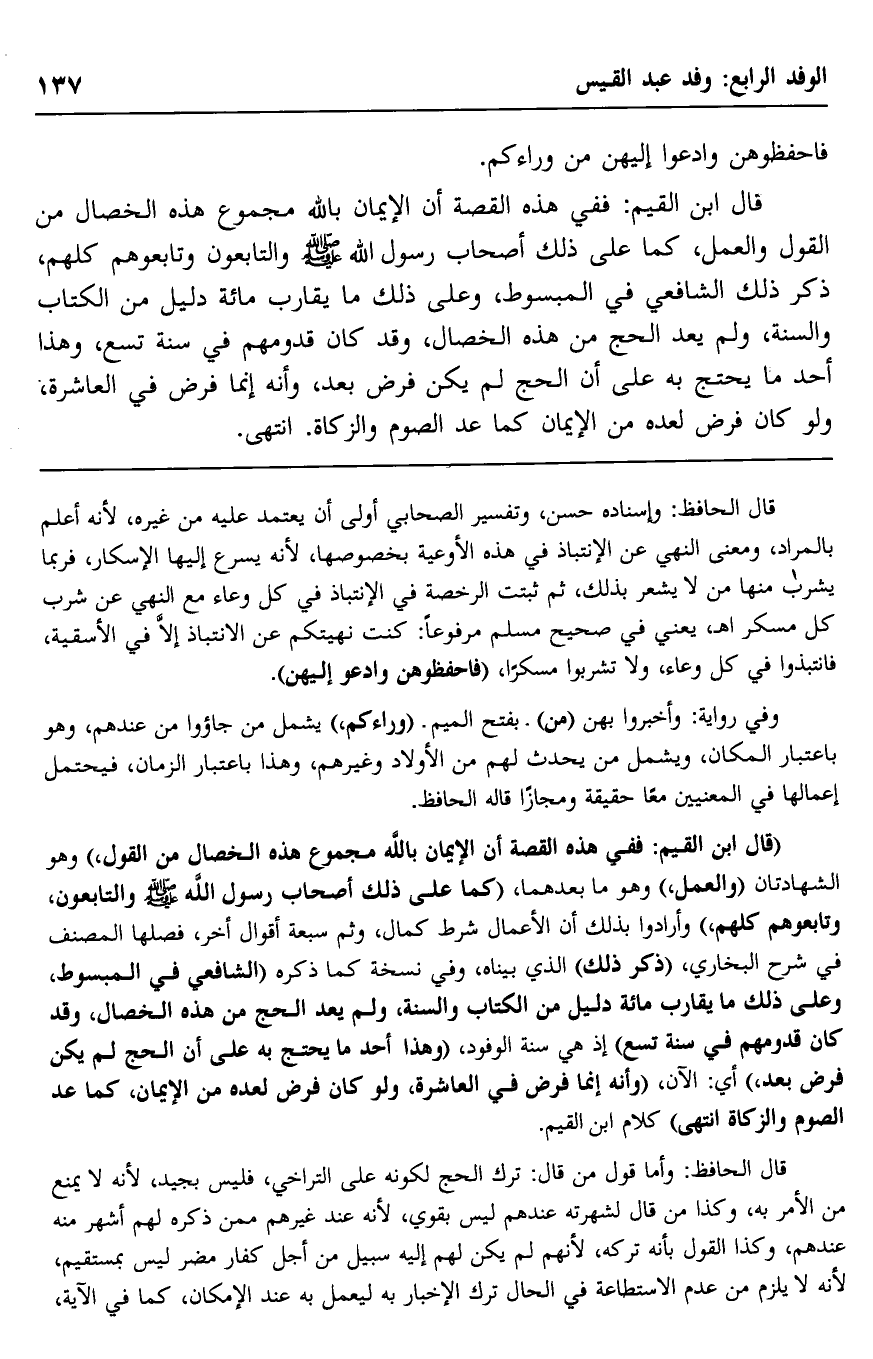 قال ابن القيم: ففي هذه القصة أن الإيمان بالله مجموع هذه الخصال من القول والعمل، كما على ذلك أصحاب رسول الله -صلى الله عليه وسلم- والتابعون موتابعوهم كلهم، ذكر ذلك الشافعي في المبسوط، وعلى ذلك ما يقارب مائة دليل من الكتاب والسنة، ولم يعد الحج من هذه الخصال، وقد كان قدومهم في سنة تسع، وهذا أحد ما يحتج به على أنَّ الحج لم يكن فُرِضَ بعد، وأنه إنما فرض في العاشرة، ولو كان فرض لعدَّه من الإيمان كما عَدَّ الصوم والزكاة. انتهى.
