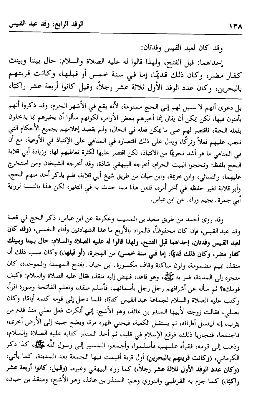 وقد روى أحمد من طريق سعيد بن المسيب وعكرمة عن ابن عباس، ذكر الحج في قصة وفد عبد القيس، فإن كان محفوظًا، فالمراد بالأربع ما عدا الشهادتين وأداء الخمس، "وقد كان لعبد القيس وفدتان، إحداهما قبل الفتح، ولهذا قالوا له -عليه الصلاة والسلام: حال بيننا وبينك كفار مضر، وكان ذلك قديمًا، إمَّا في سنة خمس" من الهجرة "أو قبلها" وكان سبب ذلك أن منقذ -بميم مضمومة، ونون ساكنة وقاف مكسورة. ابن حبان -بفتح المهملة والموحدة، كان متجره إلى المدينة، فمرَّ به -صلى الله عليه وسلم، وهو قاعد، فنهض إليه منقذ، فقال -عليه الصلاة والسلام: "كيف قومك"؟ ثم سأله عن أشرافهم رجل رجل بأسمائهم، فأسلم منقذ، وتعلّم الفاتحة وسورة اقرأ، وكتب -عليه الصلاة والسلام- لجماعة عبد القيس كتابًا، فلمَّا دخل على قومه كتمه أيامًا، وكان يصلي، فقالت زوجته لأبيها المنذر بن عائذ، وهو الأشجّ: إني أنكرت فعل بعلي منذ قدم من يثرب، إنه ليغسل أطرافه، ثم يستقبل الكعبة، فيحني ظهره مرّة، ويضع جبينه إلى الأرض أخرى، فاجتمعا فتجاريا ذلك، فوقع الإسلام في قلبه، ثم أخذ المنذر كتابه -عليه الصلاة والسلام، وذهب إلى قومه، فقرأه عليهم، فأسلموا، وأجمعوا المسير إلى رسول الله -صلى الله عليه وسلم، كذا ذكر الكرماني، "وكانت قريتهم بالبحرين" أول قرية أقيمت فيها الجمعة بعد المدينة، كما يأتي، "وكان عدد الوفد الأوّل ثلاثة عشر رجلًا" كما رواه البيهي وغيره "وقيل: كانوا أربعة عشر راكبًا" كما جزم به القرطبي والنووي, وهم: المنذر بن عائذ، وهو الأشج، ومنقذ بن حبان،