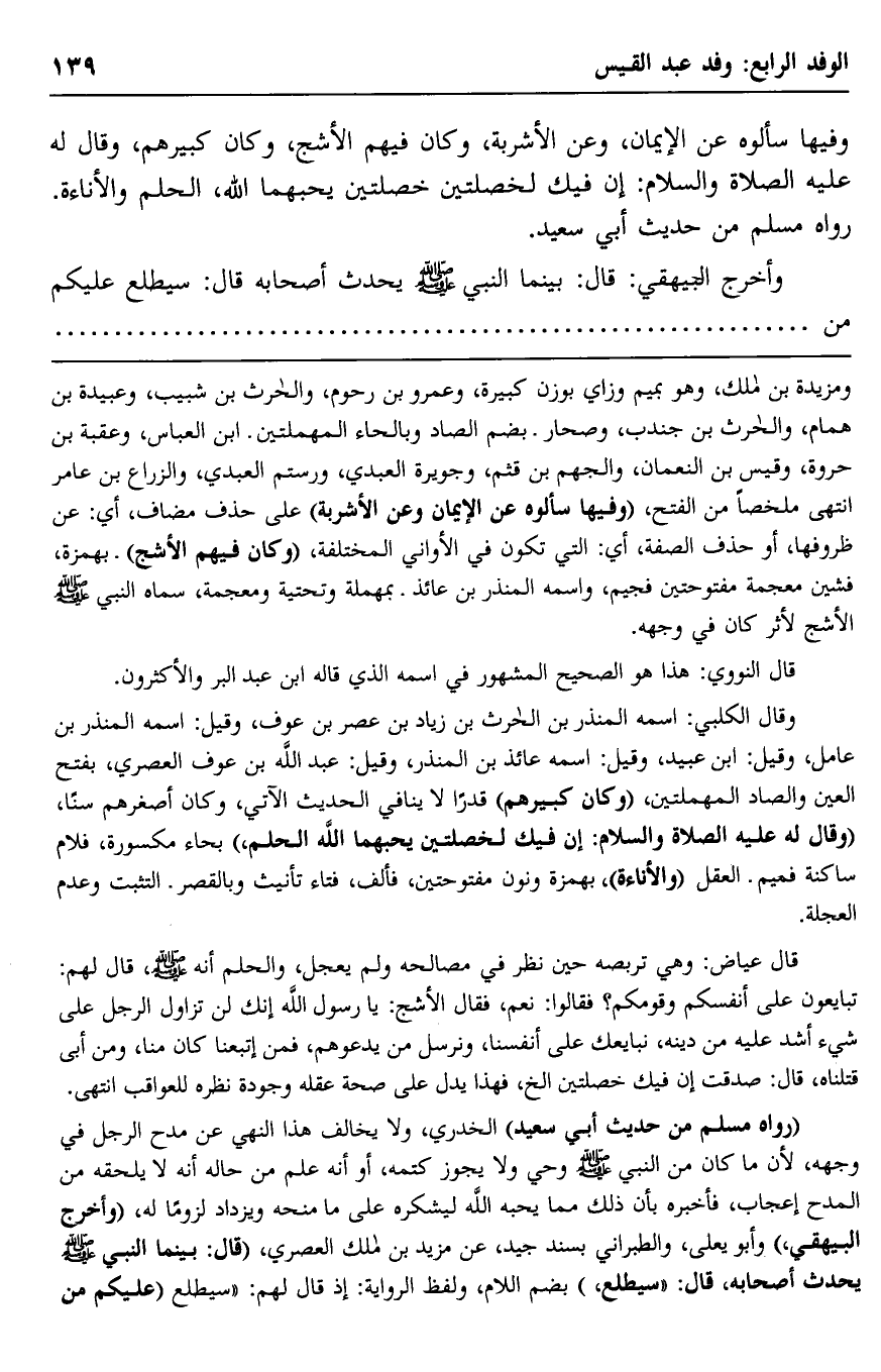 وفيها سألوه عن الإيمان، وعن الأشربة، وكان فيهم الأشج، وكان كبيرهم، وقال له -عليه الصلاة والسلام: "إن فيك خصلتين يحبهما الله: الحلم والأناءة" رواه مسلم من حديث أبي سعيد.