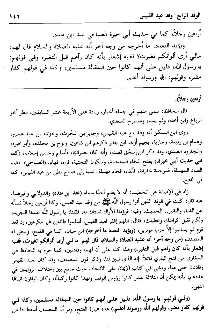 زاد في الإصابة عن الخطيب: إنه لا يعلم أحدًا سماه "عند ابن منده" والدولابي وغيرهما، عنه قال: كنت في الوفد الذين أتوا رسول الله -صلى الله عليه وسلم- من وفد عبد القيس، وكنا أربعين رجلًا نسأله عن الدباء والنقير.. الحديث، وفيه: فزودنا الأراك نستاك به، فقلنا: يا رسول الله عندنا الجريد، ولكن نقبل كرامتك وعطيتك، فقال: "اللهم اغفر لعبد القيس، أسلموا طائعين غير مكرهين، إذ قعد قوم لم يسلموا إلا خزايا موترين" , "ويؤيد التعدد ما أخرجه" ابن حبان, ما في الفتح، وبيض له المصنف "من وجه آخر؛ أنه -عليه الصلاة والسلام- قال لهم: ما لي أرى ألوانكم تغيّرت، ففيه إشعار بأنه كان رآهم قبل التغير" وهذا كله على أنَّ لهما وفادتين، كما جزم به الحافظ في المغازي من فتح الباري قائلًا: إنه الذي تبيِّنَ لنا، وذكر قول المصنّف، وقد كان لعبد القيس وفادتان حتى هنا، ومشى في كتاب الإيمان على الاتحاد؛ حث جمع بين اختلاف الروايتين في عددهم، بأنه يمكن أن الثلاثة عشر كانوا رءوس الوفد، ولهذا كانوا ركبانًا، وكان الباقون أتباعًا, انتهى.
