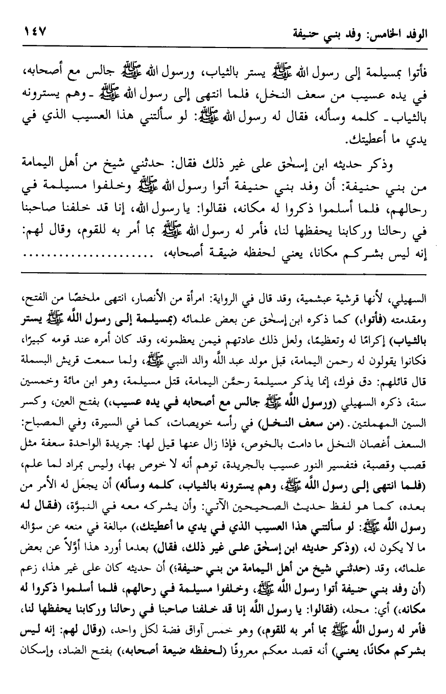 السهيلي؛ لأنها قرشية عبشمية، وقد قال في الرواية: امرأة من الأنصار، انتهى ملخصًا من الفتح، ومقدمته "فأتوا" كما ذكره ابن إسحاق عن بعض علمائه "بمسيلمة إلى رسول الله -صلى الله عليه وسلم- يستر بالثيا" إكرامًا له وتعظيمًا، ولعلّ ذلك عادتهم فيمن يعظّمونه، وقد كان أمره عند قومه كبيرًا، فكانوا يقولون له: رحمن اليمامة، قبل مولد عبد الله والد النبي -صلى الله عليه وسلم، ولما سمعت قريش البسملة قال قائلهم: دق فوك، إنما يذكر مسيلمة رحمن اليمامة، قتل مسيلمة وهو ابن ائة وخمسين سنة، ذكره السهيلي, "ورسول الله -صلى الله عليه وسلم- جالس مع أصحابه في يده عسيب" بفتح العين وكسر السين المهملتين. "من سعف النخل" في رأسه خويصات، كما في السيرة، وفي المصباح: السعف: أغصان النخل ما دامت بالخوص، فإذا زال عنها قيل لها: جريدة, الواحدة سعفة مثل قصب وقصبة، فتفسير النور عسيب بالجريدة توهّم أنه لا خوص بها، وليس بمراد لما علم، "فلما انتهى إلى رسول الله -صلى الله عليه وسلم، وهم يسترونه بالثياب، كلَّمه وسأله" أن يجعل له الأمر من بعده، كما هو لفظ حديث الصحيحين الآتي, وأن يشركه معه في النبؤة، "فقال له رسول الله -صلى الله عليه وسلم: "لو سألتني هذا العسيب الذي في يدي ما أعطيتك" مبالغة في منعه عن سؤاله ما لا يكون له، "وذكر حديثه ابن إسحاق على غير ذلك، فقال" بعدما أورد هذا أوّلًا عن بعض علمائه: وقد "حدثني شيخ من أهل اليمامة من بني حنيفة" أن حديثه كان على غير هذا، زعم "أنَّ وفد بني حنيفة أتوا رسول الله -صلى الله عليه وسلم، وخلَّفوا مسيلمة في رحالهم، فلمَّا أسلموا ذكروا له مكانه" أي: محله، "فقالوا: يا رسول الله, إنا قد خلفنا صاحبنا في رحالنا وركابنا يحفظها لنا، فأمر له رسول الله -صلى الله عليه وسلم- بما أمر به للقوم" وهو خمس آواقٍ فضة لكل واحد، "وقال لهم: "إنه ليس بشركم مكانًا" يعني: " أنه قصد معكم معروفًا "لحفظه ضيعة أصحابه" بفتح الضاد، وإسكان