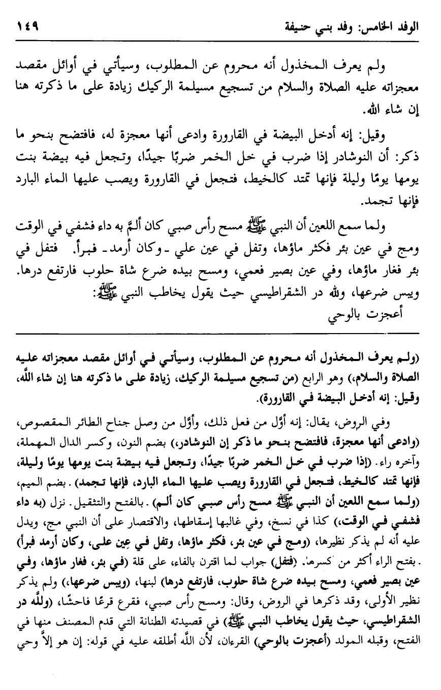 "ولم يعرف المخذول أنه محروم عن المطلوب، وسيأتي في أوائل مقصد معجزاته -عليه الصلاة والسلام" وهو الرابع "من تسجيع مسيلمة الركيك، زيادة على ما ذكرته هنا إن شاء الله، وقيل: إنه أدخل البيضة في القارورة".