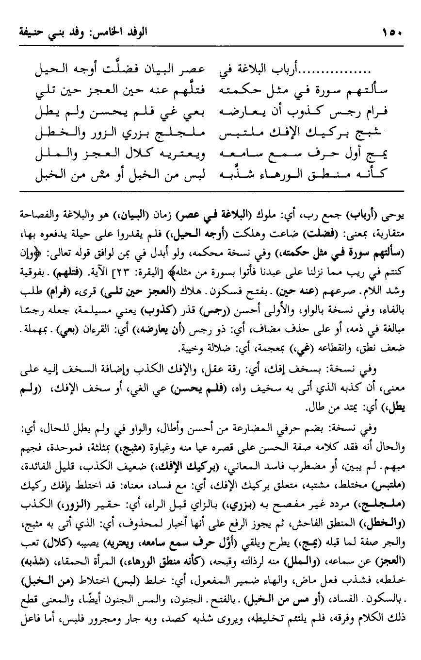 يوحى "أرباب" جمع رب، أي: ملوك "البلاغة في عصر" زمان "البيان" هو والبلاغة والفصاحة متقاربة بمعنى, "فضلّت" ضاعت وهلكت "أوجه الحيل", فلم يقدروا على حيلة يدفعوه بها، "سألتهم سورة في مثل حكمته" وفي نسخة محكمه، ولو أبدل في بمن لوافق قوله تعالى: {وَإِنْ كُنْتُمْ فِي رَيْبٍ مِمَّا نَزَّلْنَا عَلَى عَبْدِنَا فَأْتُوا بِسُورَةٍ مِّنْ مِثْلِهِ} [البقرة: 23] الآية, "فتلهم". بفوقية وشد اللام. صرعهم "عنه حين". بفتح فسكون. هلاك "العجز حين تلي" قرئ "فرام" طلب بالفاء، وفي نسخة بالواو، والأُولَى أحسن "رجس" قذر "كذوب" يعني: مسيلمة، جعله رجسًا مبالغة في ذمه، أو على حذف مضاف، أي: ذو رجس "أن يعارضه" أي: القرآن "بعي" بمهملة. ضعف نطق، وانقطاعه "غي" بمعجمة، أي: ضلالة وخيبة.