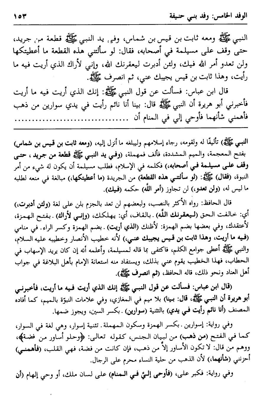 النبي -صلى الله عليه وسلم- معه ثابت بن قيس بن شماس، وفي يد النبي -صلى الله عليه وسلم- قطعة من جريد، حتى وقف على مسيلمة في أصحابه، فقال: "لو سالتني هذه القطعة ما أعطيتكها ولن تعدو أمر الله فيك، ولئن أدبرت ليعقرنك الله، وإني لأراك الذي أريت فيه ما رأيت، وهذا ثابت بن قيس يجيبك عني"، ثم انصرف -صلى الله عليه وسلم.