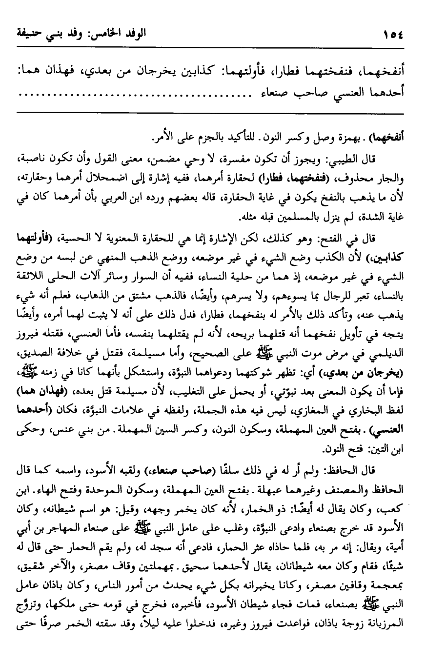 انفخهما، فنفختهما فطارا، فأولتهما: كذابين يخرجان من بعدي، فهذان هما: أحدهما العنسي صاحب صنعاء