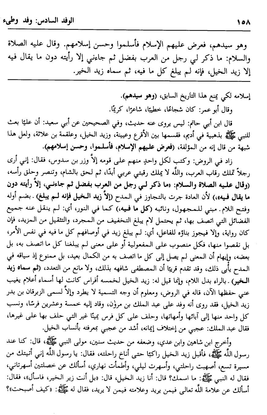 وأخرج ابن شاهين وابن عدي، وضعَّفه من حديث سنين، مولى النبي -صلى الله عليه وسلم، قال: كنا عند رسول الله -صلى الله عليه وسلم، فأقبل زيد الخيل راكبًا حتى أناخ راحلته، فقال: يا رسول الله, إني أتيتك من مسيرة تسع، أصهبت راحلتي، وأسهرت ليلي، وأظمأت نهاري، أسألك عن خصلتين أسهرتاني، فقال له النبي -صلى الله عليه وسلم: "ما اسم"؟ قال: أنا زيد الخيل، قال: "بل أنت زيد الخير، فاسأل"، فقال: أسألك عن علامة الله تعالى فيمن يريد, وعلامته فيمن لا يريد، فقال له -صلى الله عليه وسلم: "كيف أصبحت"؟