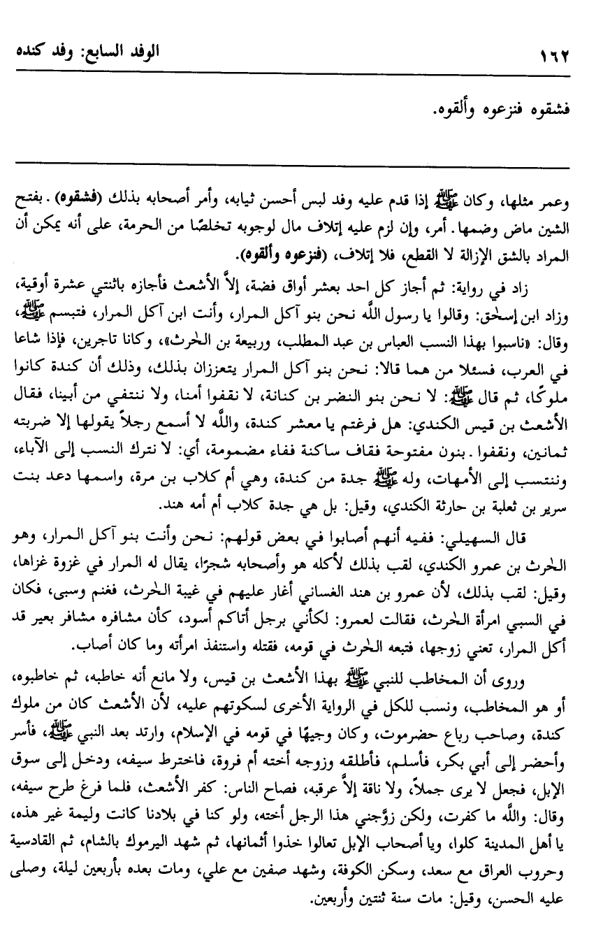زاد في رواية: ثم أجاز كل أحد بعشر أواق فضة، إلّا الأشعث فأجازه باثنتي عشرة أوقية، وزاد ابن إسحاق: وقالوا يا رسول الله, نحن بنو آكل المرار، وأنت ابن آكل المرار، فتبسَّم -صلى الله عليه وسلم، وقال: $"ناسبوا بهذا النسب العباس بن عبد المطلب، وربيعة بن الحارث"، وكانا تاجرين، فإذا شاعا في العرب، فسئلا من هما قالا: نحن بنو آكل المرار, يتعززان بذلك، وذلك أن كندة كانوا ملوكًا، ثم قال -صلى الله عليه وسلم: $"لا نحن بنو النضر بن كنانة، لا نقفوا أمنا، ولا ننتفي من أبينا"، فقال الأشعث بن قيس الكندي، هل فرغتم يا معشر كندة، والله لا أسمع رجلًا يقولها إلّا ضربته ثمانين، ونقفوا -بنون مفتوحة فقاف ساكنة ففاء مضمومة، أي: لا نترك النسب إلى الآباء، وننتسب إلى الأمهات، وله -صلى الله عليه وسلم- جدة من كندة، وهي أم كلاب بن مرة، واسمها: دعد بنت سرير بن ثعلبة بن حارثة الكندي، وقيل: بل هي جدة كلاب أم أمّه هند.