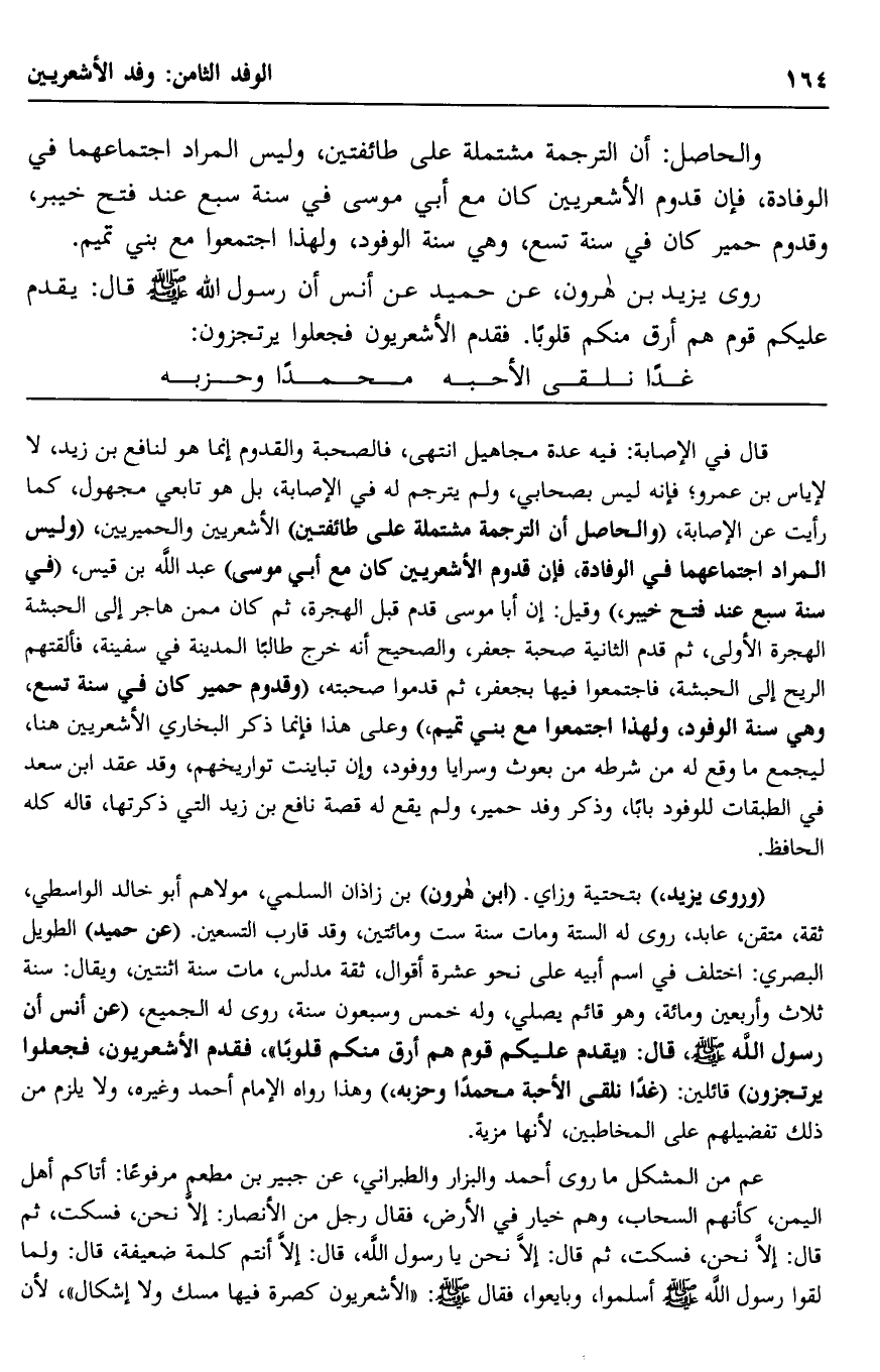"وروى يزيد" بتحتية وزاي "ابن هارون" بن زاذان السلمي، مولاهم أبو خالد الواسطي، ثقة متقن، عابد، روى له الستة, ومات سنة ست ومائتين، وقد قارب التسعين, "عن حميد" الطويل البصري: اختلف في اسم أبيه على نحو عشرة أقوال، ثقة مدلس، مات سنة اثنتين، ويقال: سنة ثلاث وأربعين ومائة، وهو قائم يصلي، وله خمس وسبعون سنة، روى له الجميع، "عن أنس أن رسول الله -صلى الله عليه وسلم- قال: "يقدم عليكم قوم هم أرقّ منكم قلوبًا"، فقدم الأشعريون، فجعلوا يرتجزون" قائلين: "غدًا نلقى الأحبة محمدًا وحزبه،" وهذا رواه الإمام أحمد وغيره، ولا يلزم من ذلك تفضيلهم على المخاطبين؛ لأنها مزية.