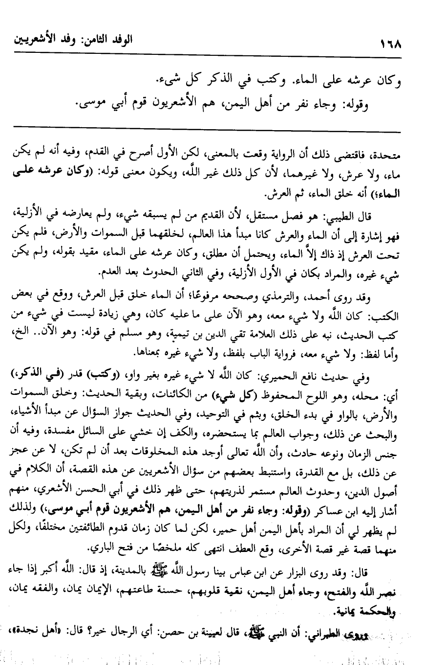 وقد روى أحمد، والترمذي وصحَّحه مرفوعًا؛ أنَّ الماء خلق قبل العرش، ووقع في بعض الكتب: كان الله ولا شيء معه، وهو الآن على ما عليه كان، وهي زيادة ليست في شيء من كتب الحديث، نبه على ذلك العلامة تقي الدين بن تيمية، وهو مسلم في قوله: "وهو الآن".. إلخ، وأما لفظ: ولا شيء معه، فرواية الباب بلفظ: "ولا شيء غيره" بمعناها.