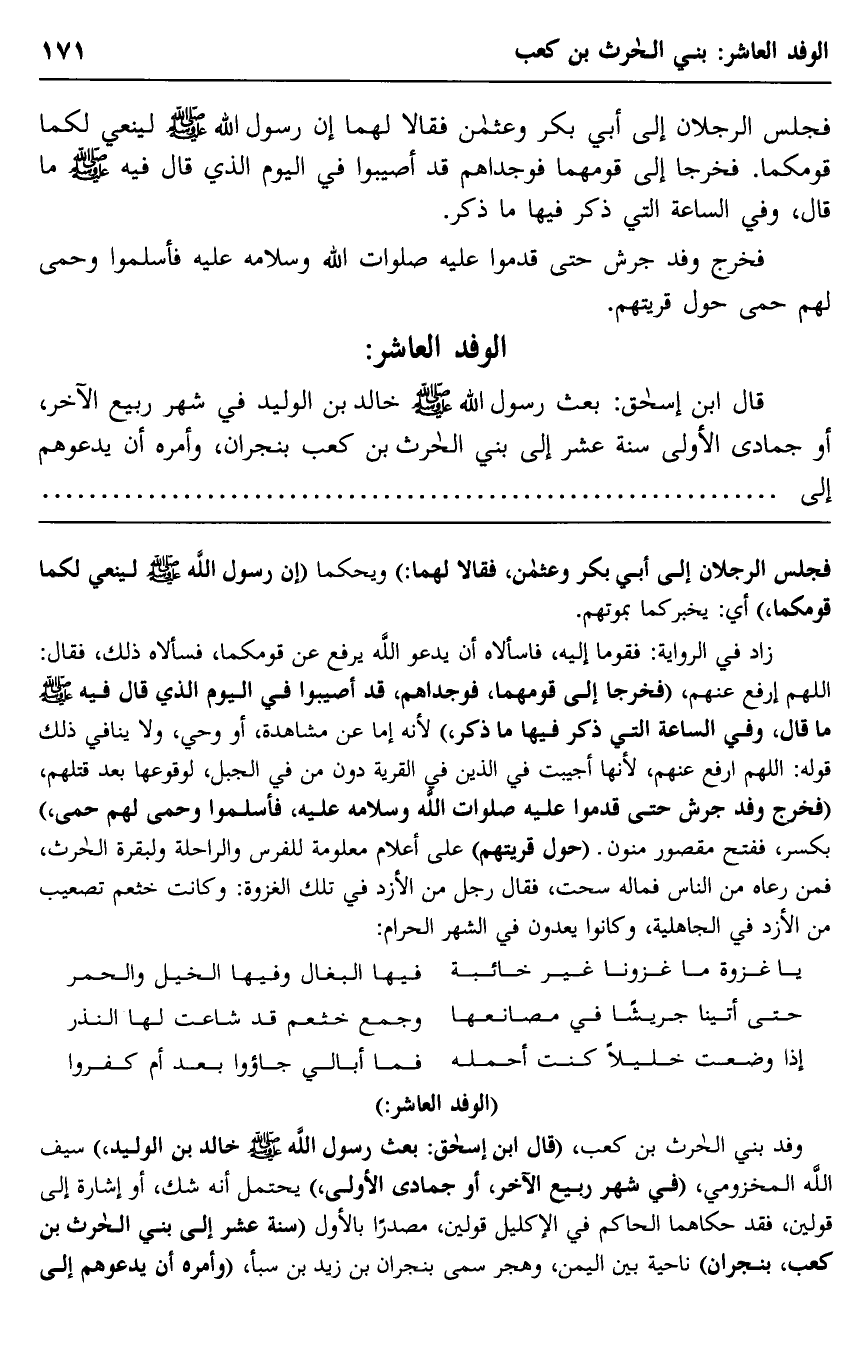وقد بنى الحارث بن كعب، "قال ابن إسحاق: بعث رسول الله -صلى الله عليه وسلم- خالد بن الوليد،" سيف الله المخزومي "في شهر ربيع الآخر، أو جمادى الأولى،" يحتمل أنه شك، أو إشارة إلى قولين، فقد حكاهما الحاكم في الإكليل قولين، مصدِّرًا بالأول "سنة عشر, إلى بني الحارث بن كعب، بنجران" ناحية بين اليمن وهجر, سُمِّيَ بنجران بن زيد بن سبأ، "وأمره أن يدعوهم إلى