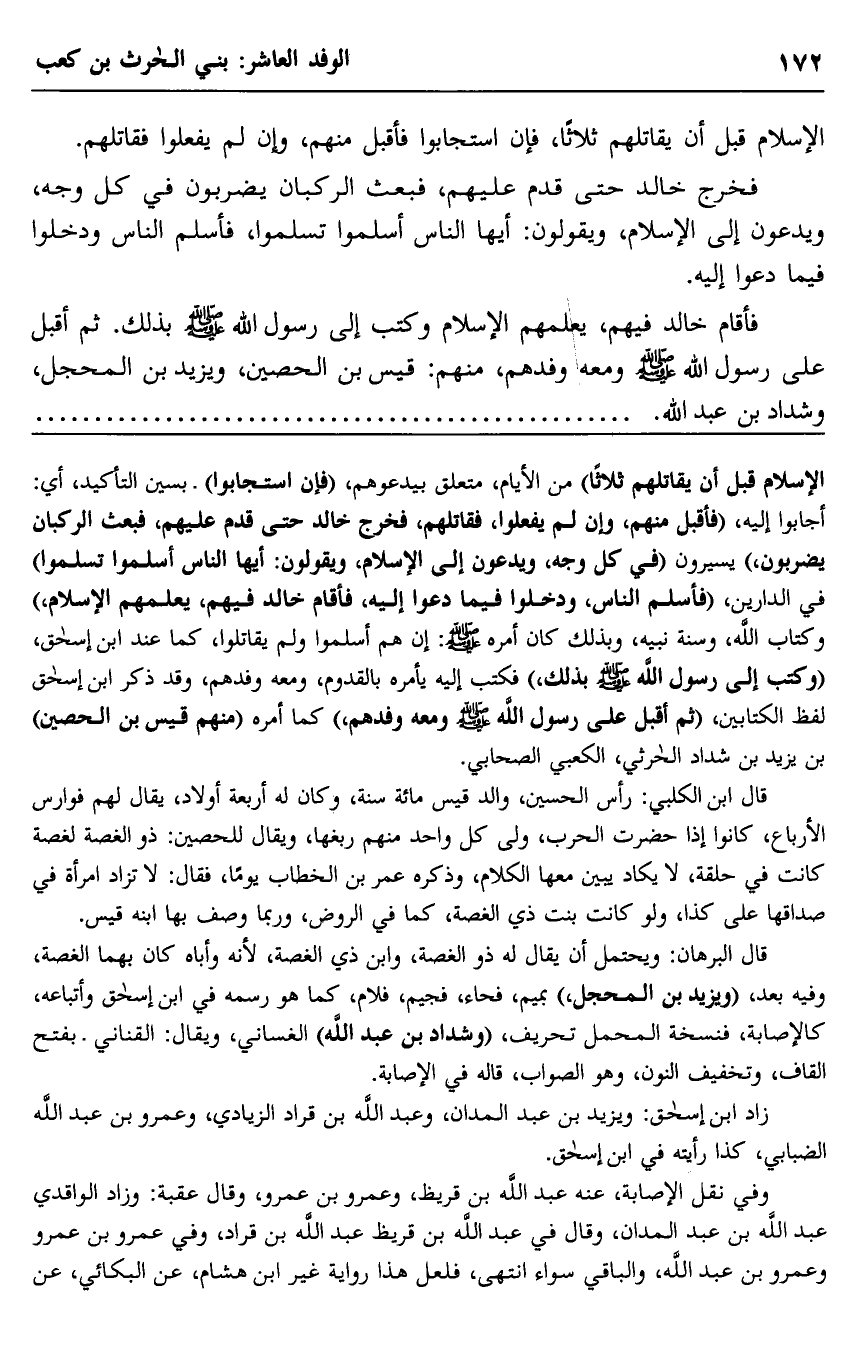 الإسلام قبل أن يقاتلهم ثلاثًا" من الأيام، متعلق بيدعوهم، "فإن استجابوا" بسين التأكيد، أي: أجابوا إليه، "فاقبل منهم، وإن لم يفعلوا، فقاتلهم، فخرج خالد حتى قدم عليهم، فبعث الركبان يضربون" يسيرون "في كل وجه، ويدعون إلى الإسلام، ويقولون: أيها الناس أسلموا تسلموا" في الدارين، "فأسلم الناس، ودخلوا فيما دعوا إليه، فأقام خالد فيهم يعلمهم الإسلام" وكتاب الله وسنة نبيه، وبذلك كان أمره -صلى الله عليه وسلم: إن هم أسلموا ولم يقاتلوا، كما عند ابن إسحاق، "وكتب إلى رسول الله -صلى الله عليه وسلم- بذلك" فكتب إليه يأمره بالقدوم، ومعه وفدهم، وقد ذكر ابن إسحاق لفظ الكتابين، "ثم أقبل على رسول الله -صلى الله عليه وسلم- ومعه وفدهم" كما أمره "منهم قيس بن الحصين" بن يزيد بن شداد الحارثي الكعبي الصحابي.
