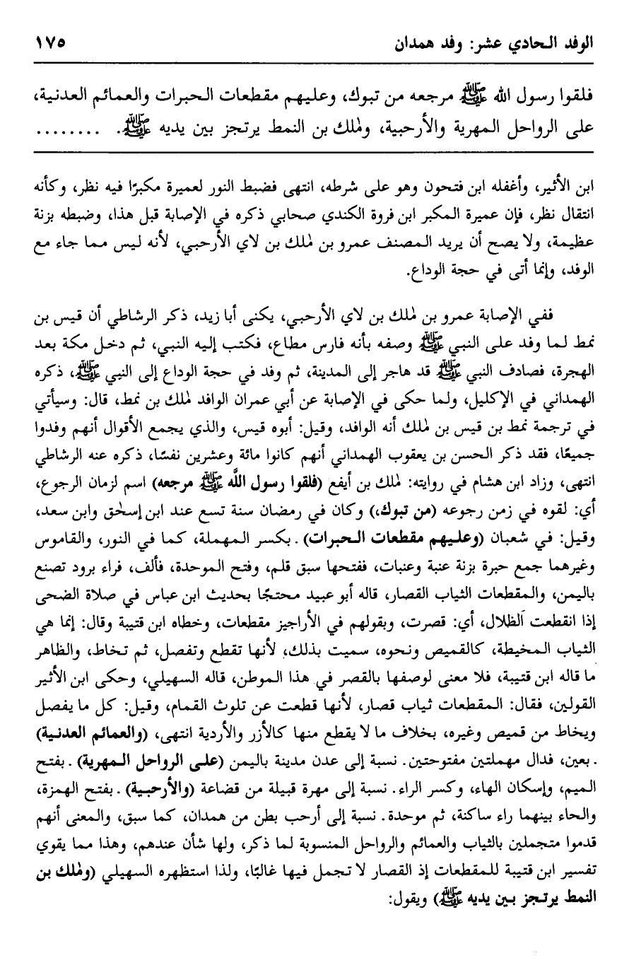 ففي الإصابة: عمرو بن مالك بن لاي الأرحبي، يكنَّى أبا زيد، ذكر الرشاطي أن قيس بن نمط لما وفد على النبي -صلى الله عليه وسلم, وصفه بأنه فارس مطاع، فكتب إليه النبي، ثم دخل مكة بعد الهجرة، فصادف النبي -صلى الله عليه وسلم- قد هاجر إلى المدينة، ثم وفد في حجة الوداع إلى النبي -صلى الله عليه وسلم، ذكره الهمداني في الإكليل، ولما حكى في الإصابة عن أبي عمران الوافد مالك بن نمط، قال: وسيأتي في ترجمة نمط بن قيس بن مالك أنه الوافد، وقيل: أبوه قيس، والذي يجمع الأقوال أنهم وفدوا جميعًا، فقد ذكر الحسن بن يعقوب الهمداني أنهم كانوا مائة وعشرين نفسًا، ذكره عنه الرشاطي. انتهى، وزاد ابن هشام في روايته: مالك بن أيفع, "فلقوا رسول الله -صلى الله عليه وسلم- مرجعه" اسم لزمان الرجوع، أي: لقوه في زمن رجوعه "من تبوك", وكان في رمضان سنة تسع عند ابن إسحاق وابن سعد، وقيل: في شعبان, "وعليهم مقطعات الحبرات" بكسر المهملة، كما في النور، والقاموس وغيرهما, جمع حبرة, بزنة عنبة وعنبات، ففتحها سبق قلم -وفتح الموحدة فألف فراء- برود تصنع باليمن، والمقطعات: الثياب القصار، قاله أبو عبيد محتجًّا بحديث ابن عباس في صلاة الضحى: إذا انقطعت الظلال، أي: قصرت، وبقولهم في الأراجيز: مقطعات، وخطاه ابن قتيبة وقال: إنما هي الثياب المخيطة، كالقميص ونحوه، سُمِّيَت بذلك؛ لأنها تقطع وتفصّل ثم تخاط، والظاهر ما قاله ابن قتيبة، فلا معنى لوصفها بالقصر في هذا الموطن، قاله السهيلي، وحكى ابن الأثير القولين، فقال: المقطعات ثياب قصار؛ لأنها قطعت عن تلوث القمام. وقيل: كل ما يفصّل ويخاط من قيمص وغيره، بخلاف ما لا يقطع منها كالأزر والأردية. انتهى. "والعمائم العدنية" بعين فدال مهملتين مفتوحتين- نسبة إلى عدن, مدينة باليمن, "على الرواحل المهرية" بفتح الميم وإسكان الهاء وكسر الراء- نسبة إلى مهرة قبيلة من قضاعة "والأرحبية" بفتح الهمزة والحاء بينهما راء ساكنة ثم موحدة- نسبة إلى أرحب, بطن من همدان, كما سبق، والمعنى: إنهم قدموا متجمِّلين بالثياب والعمائم والرواحل المنسوبة لما ذكر، ولها شأن عندهم، وهذا مما يقوي تفسير ابن قتيبة للمقطعات؛ إذ القصار لا تجمل فيها غالبًا، ولذا استظهره السهيلي, "ومالك بن النمط يرتجز بين يديه -صلى الله عليه وسلم" ويقول: