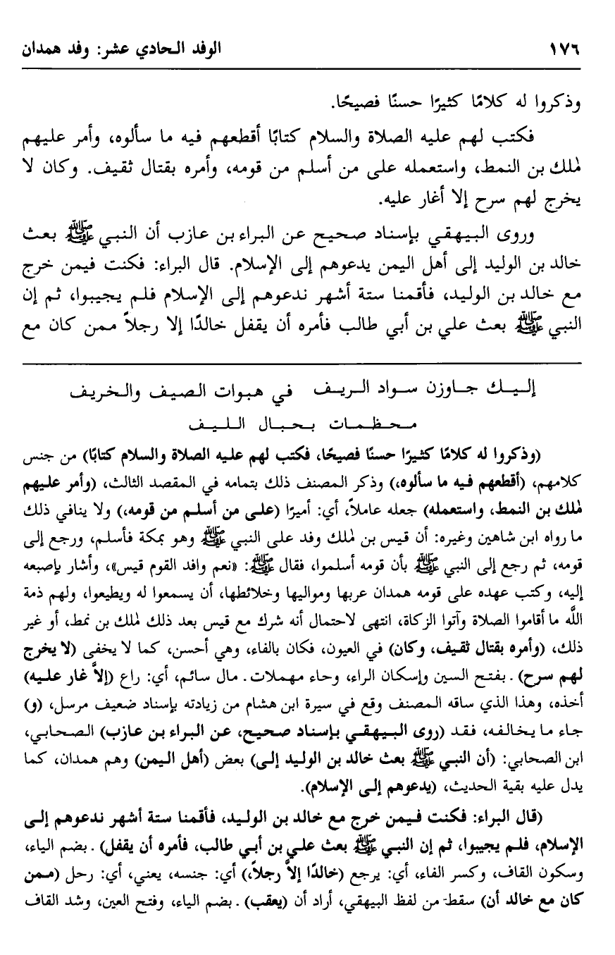 "وذكروا له كلامًا كثيرًا حسنًا فصيحًا، فكتب لهم -عليه الصلاة والسلام- كتابًا" من جنس كلامهم، "أقطعهم فيه ما سألوه" وذكر المصنف ذلك بتمامه في المقصد الثالث, "وأمَّرَ عليهم مالك بن النمط، واستعمله" جعله عاملًا، أي: أميرًا "على من أسلم من قومه" ولا ينافي ذلك ما رواه ابن شاهين وغيره: أن قيس بن مالك وفد على النبي -صلى الله عليه وسلم- وهو بمكة فأسلم، ورجع إلى قومه، ثم رجع إلى النبي -صلى الله عليه وسلم- بأنَّ قومه أسلموا، فقال -صلى الله عليه وسلم: "نعم وافد القوم قيس" وأشار بإصبعه إليه، وكتب عهده على قومه همدان: عربها ومواليها وخلائطها، أن يسمعوا له ويطيعوا، ولهم ذمة الله ما أقاموا الصلاة وآتوا الزكاة، انتهى لاحتمال أنَّه شرك مع قيس بعد ذلك مالك بن نمط، أو غير ذلك، "وأمره بقتال ثقيف، وكان" في العيون، فكان بالفاء، وهي أحسن، كما لا يخفى "لا يخرج لهم سرح" بفتح السين وإسكان الراء وحاء مهملات: مال سائم، أي: راع "إلا غار عليه" أخذه، وهذا الذي ساقه المصنف وقع في سيرة ابن هشام من زيادته بإسناد ضعيف مرسل، "و" جاء ما يخالفه، فقد "روى البيهقي بإسناد صحيح، عن البراء بن عازب" الصحابي ابن الصحابي, "أن النبي -صلى الله عليه وسلم- بعث خالد بن الوليد إلى" بعض "أهل اليمن" وهم همدان، كما يدل عليه بقية الحديث، "يدعوهم إلى الإسلام".