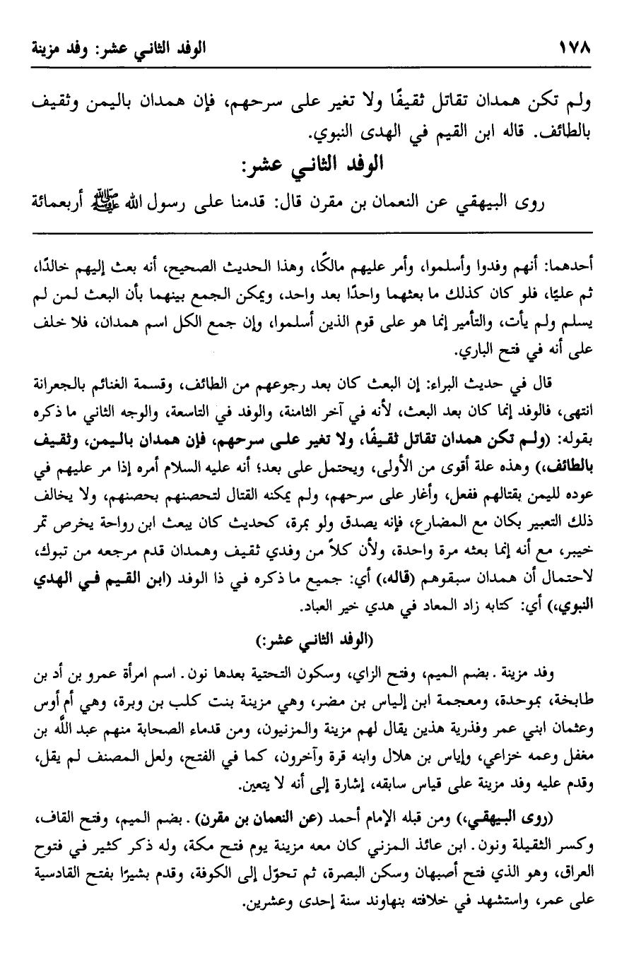 قال في حديث البراء: إن البعث كان بعد رجوعهم من الطائف، وقسمة الغنائم بالجعرانة. انتهى، فالوفد إنما كان بعد البعث؛ لأنه في آخر الثامنة، والوفد في التاسعة، والوجه الثاني ما ذكره بقوله: "ولم تكن همدان تقاتل ثقيفًا، ولا تُغِيرُ على سرحهم، فإن همدان باليمن، وثقيف بالطائف" وهذه علة أقوى من الأولى، ويحتمل على بعد أنه -عليه السلام- أمره إذا مَرَّ عليهم في عوده لليمين بقتالهم ففعل، وأغار على سرحهم، ولم يمكنه القتال لتحصنهم بحصنهم، ولا يخالف ذلك التعبير بكان مع المضارع، فإنه يصدق ولو بمرة، كحديث كان يبعث ابن رواحة يخرص تمر خيبر، مع أنه إنما بعثه مرة واحدة، ولأن كلًّا من وفدي ثقيف وهمدان قدم مراجعة من تبوك؛ لاحتمال أن همدان سبقوهم "قاله" أي: جميع ما ذكره في ذا الوفد "ابن القيم في الهدي النبوي" أي: كتابه: زاد المعاد في هدي خير العباد.