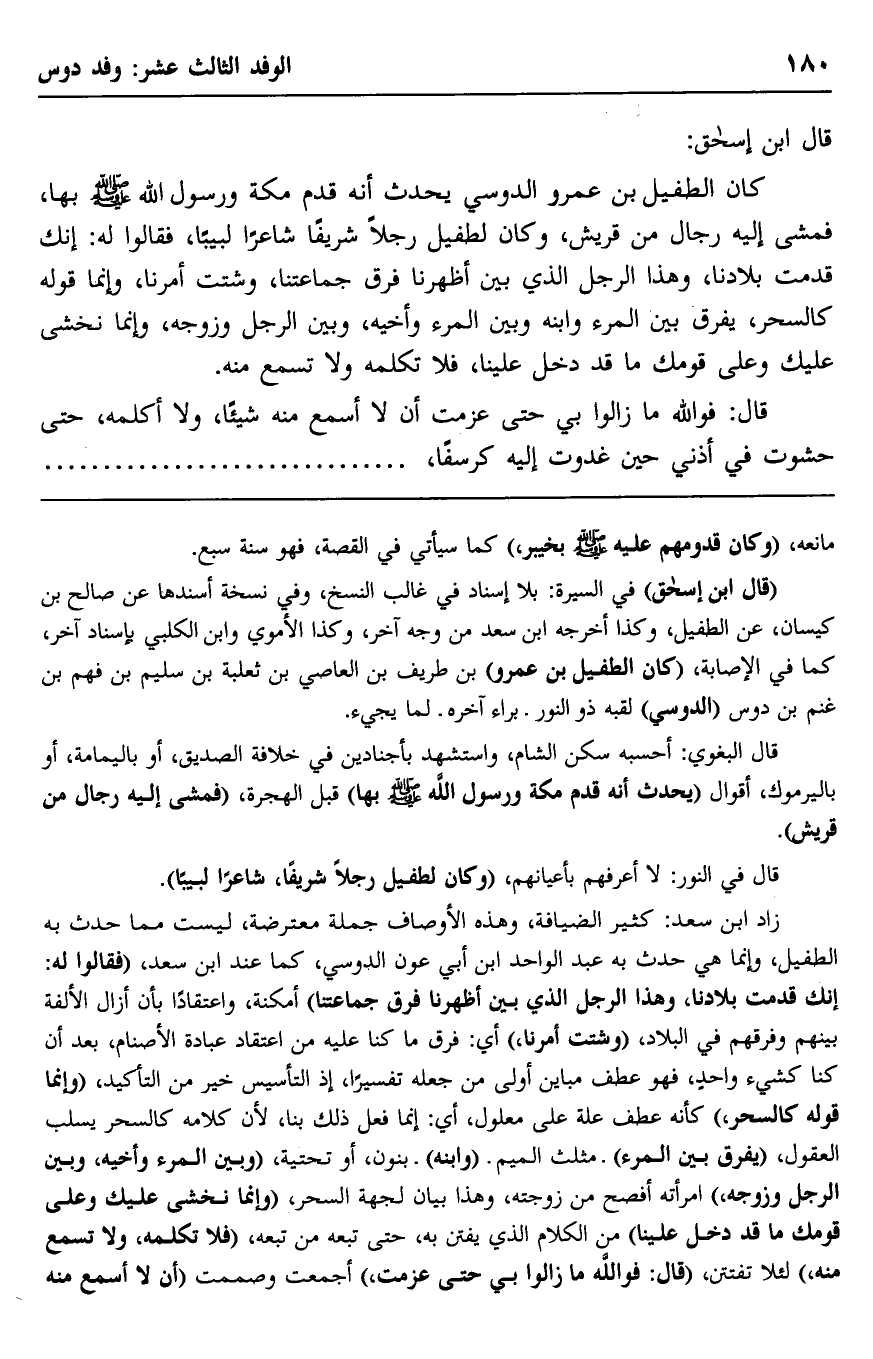 "قال ابن إسحاق" في السيرة بلا إسناد في غالب النُّسَخ، وفي نسخة أسندها عن صالح بن كيسان، عن الطفيل، وكذا أخرجه ابن سعد من وجه آخر، وكذا الأموي وابن الكلبي بإسناد آخر، كما في الإصابة، "كان الطفيل بن عمرو" بن طريف بن العاص بن ثعلبة بن سليم بن فهم بن غنم بن دوس "الدوسي" لقبه ذو النور -براء آخره- لما يجيء.