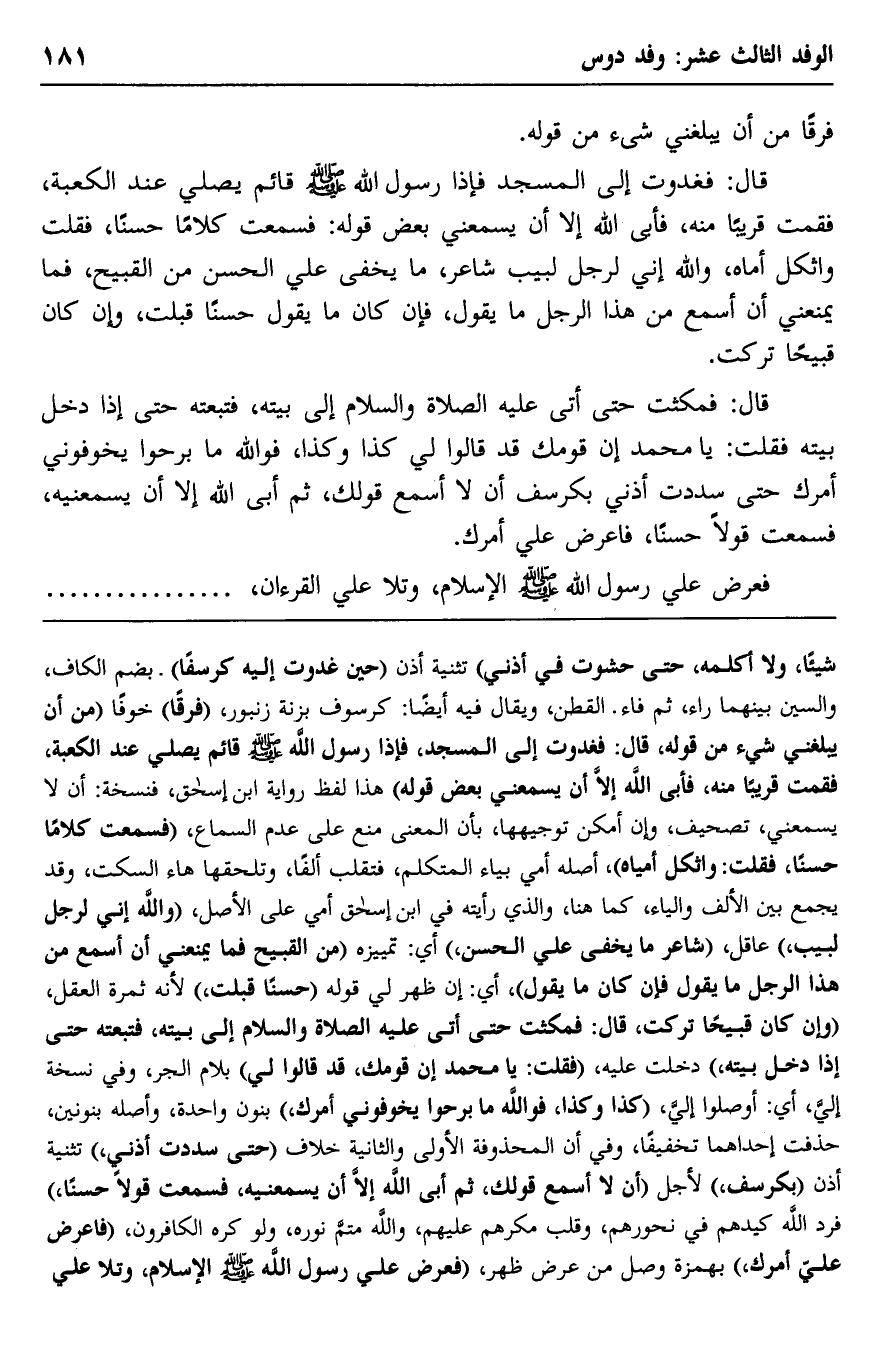 قال: فمكثت حتى أتى -عليه الصلاة والسلام- إلى بيته، فتبعته حتى إذا دخل بيته فقلت: يا محمد, إن قومك قد قالوا لي كذا وكذا، فوالله ما برحوا يخوّفوني أمرك حتى سددت أذني بكرسف أن لا أسمع قولك، ثم أبى الله إلا أن يسمعنيه، فسمعت قولًا حسنًا، فاعرض عليَّ أمرك.