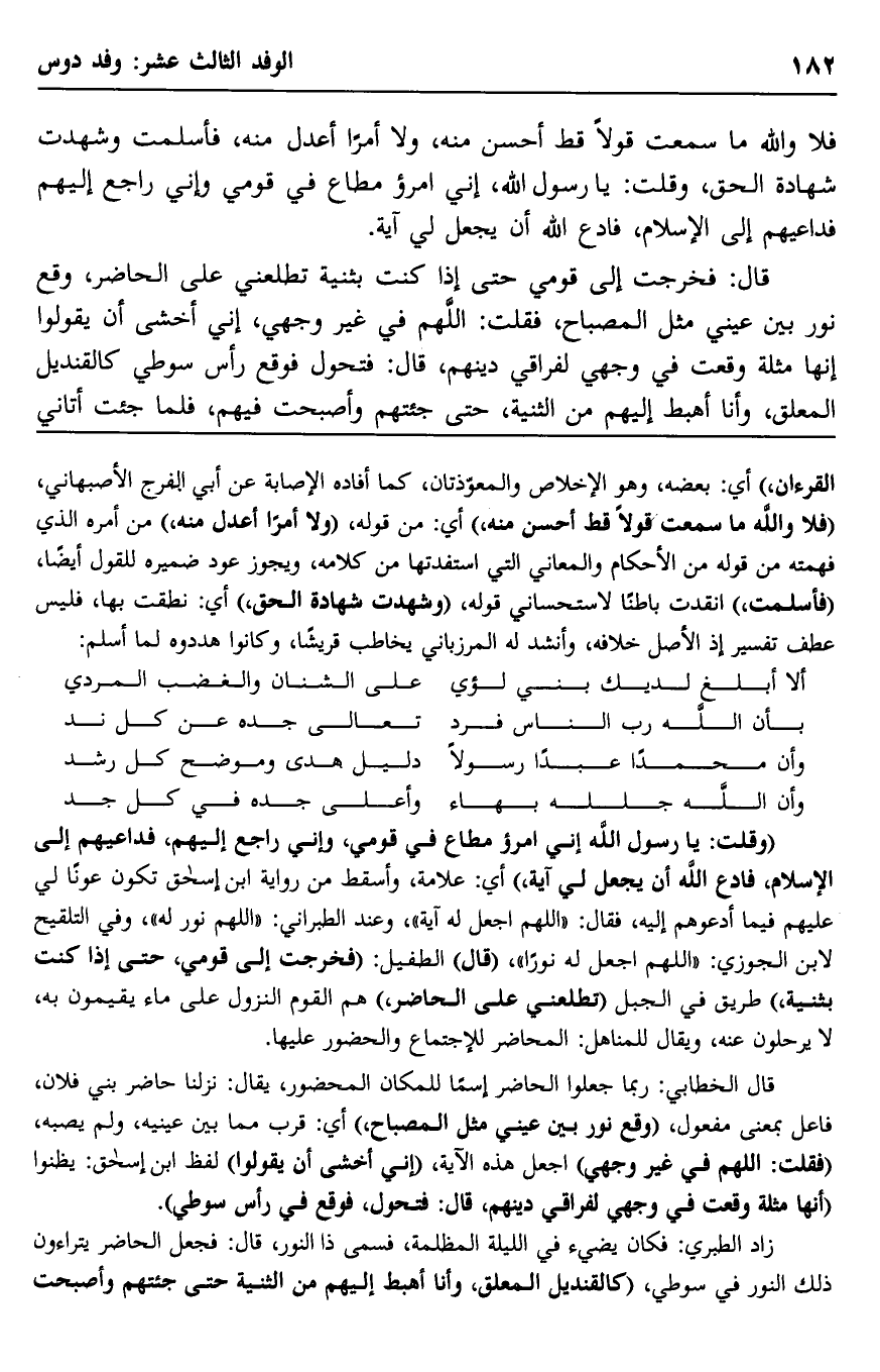 زاد الطبري: فكان يضيء في الليلة المظلمة، فسمِّيَ ذا النور، قال: فجعل الحاضر يتراءون ذلك النور في سوطي، "كالقنديل المعلق، وأنا أهبط إليهم من الثنية حتى جئتهم وأصبحت