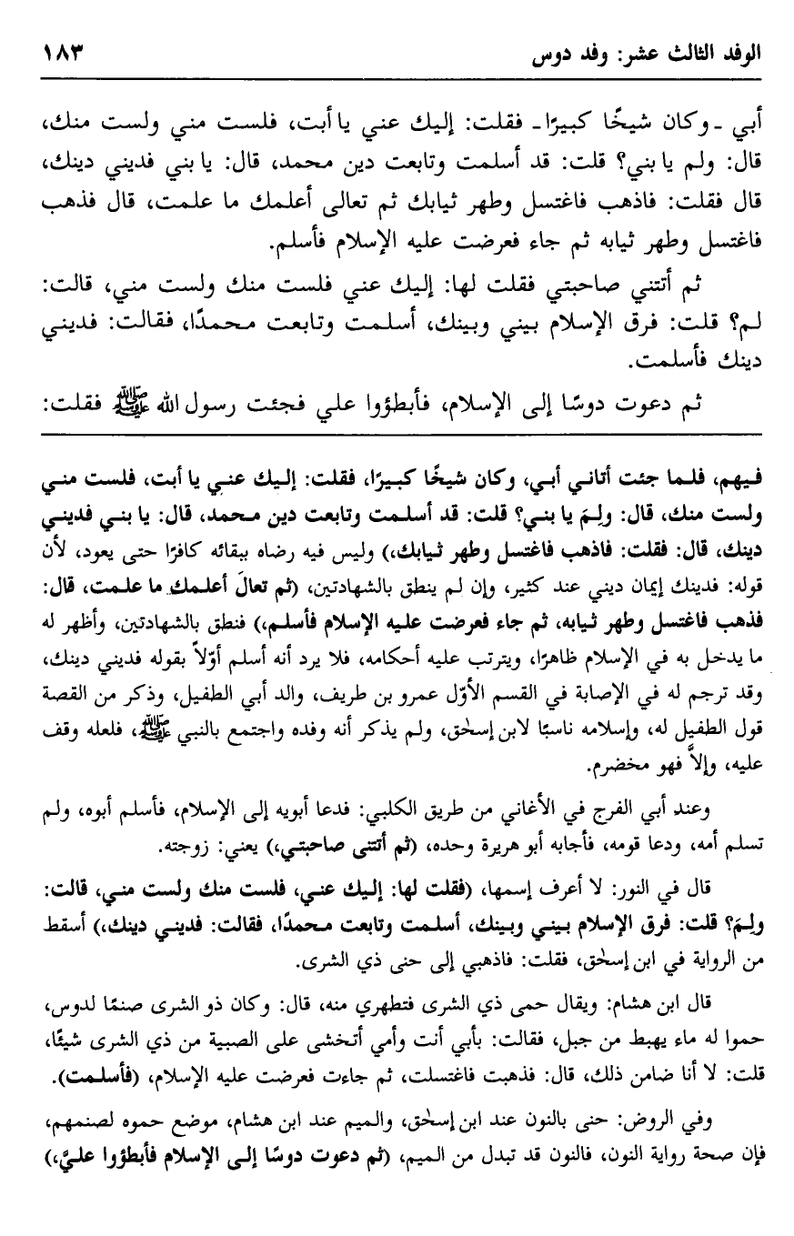 قال في النور: لا أعرف اسمها، "فقلت لها: إليك عني، فلستُ منك ولستِ مني، قالت: ولِمَ؟ قلت: فرَّق الإسلام بيني وبينك، أسلمت وتابعت محمدًا، فقالت: فديني دينك" أسقط من الرواية في ابن إسحاق، فقلت: فاذهبي إلى حنى ذي الشرى.